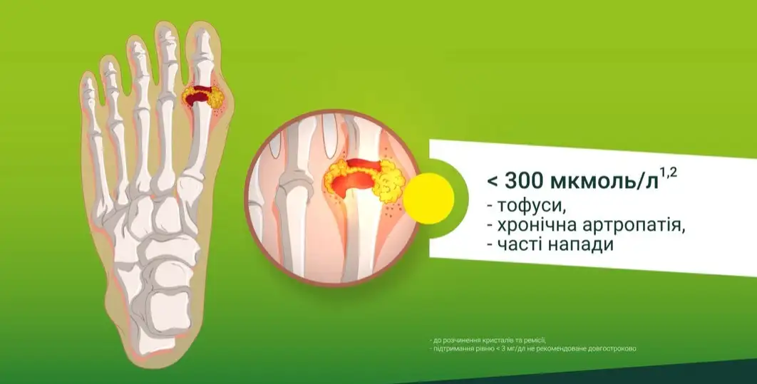 Цільовий рівень сечової кислоти при подагрі: < 360 мкмоль/л