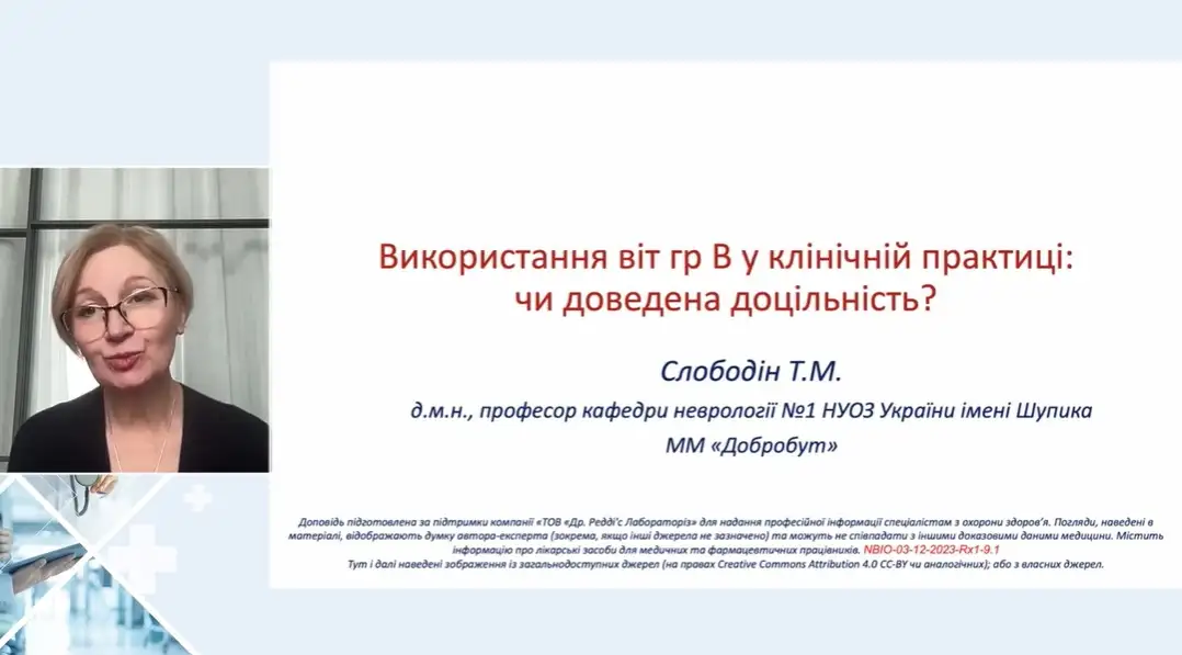 До Вашої уваги виступ професора Слободін Тетяни Миколаївни щодо обговорення нових 2023 Клінічних рекомендації щодо застосування нейротропних вітамінів групи В (В1, В6, В12) для лікування периферичної нейропатії: консенсус міждисциплінарної групи експертів. Виступ відбувся на І Міжнародній фаховій школі «Сучасна медицина: шляхи вдосконалення здоров’я людини», яка проходила 5 грудня 2023 року з онлайн трансляцією для лікарів усіх областей України на платформі: webinar.livevideo.com.ua