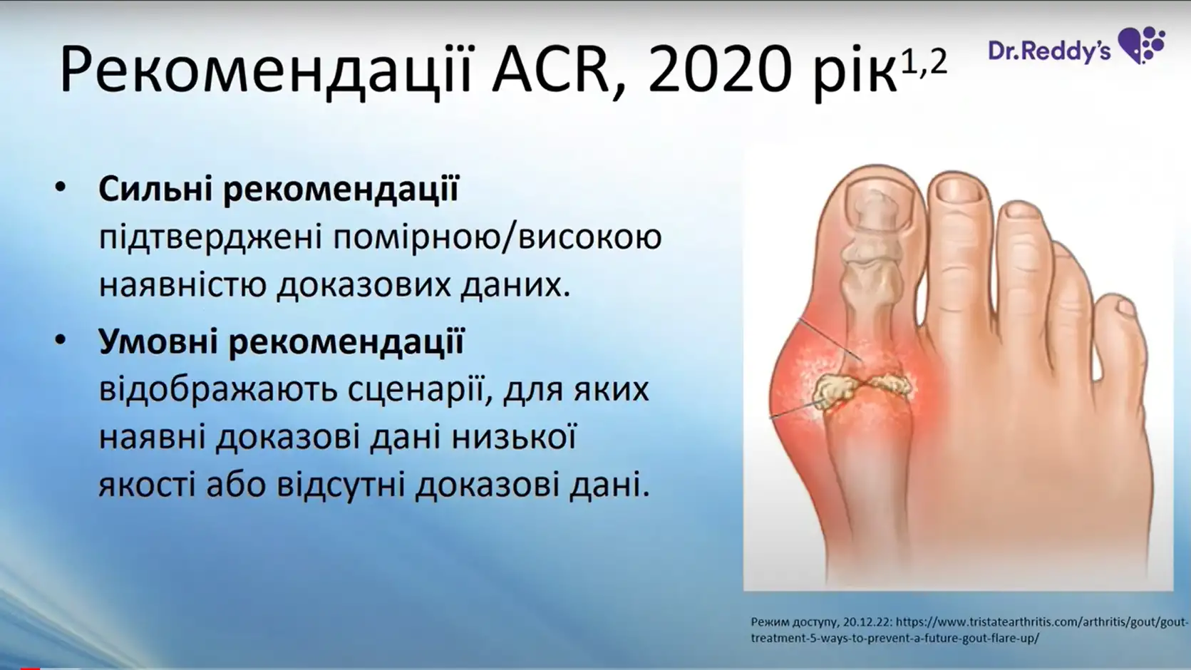 Показання до уратзнижувальної терапії (УЗТ). УЗТ рекомендовано починати пацієнтам з подагрою, які відповідають будь-якому з наступних критеріїв: наявність ≥1 підшкірного тофусу; рентгенографічні докази ураження, які можна віднести до подагри; часті загострення подагри (≥2 загострень щорічно) (сильна рекомендація).