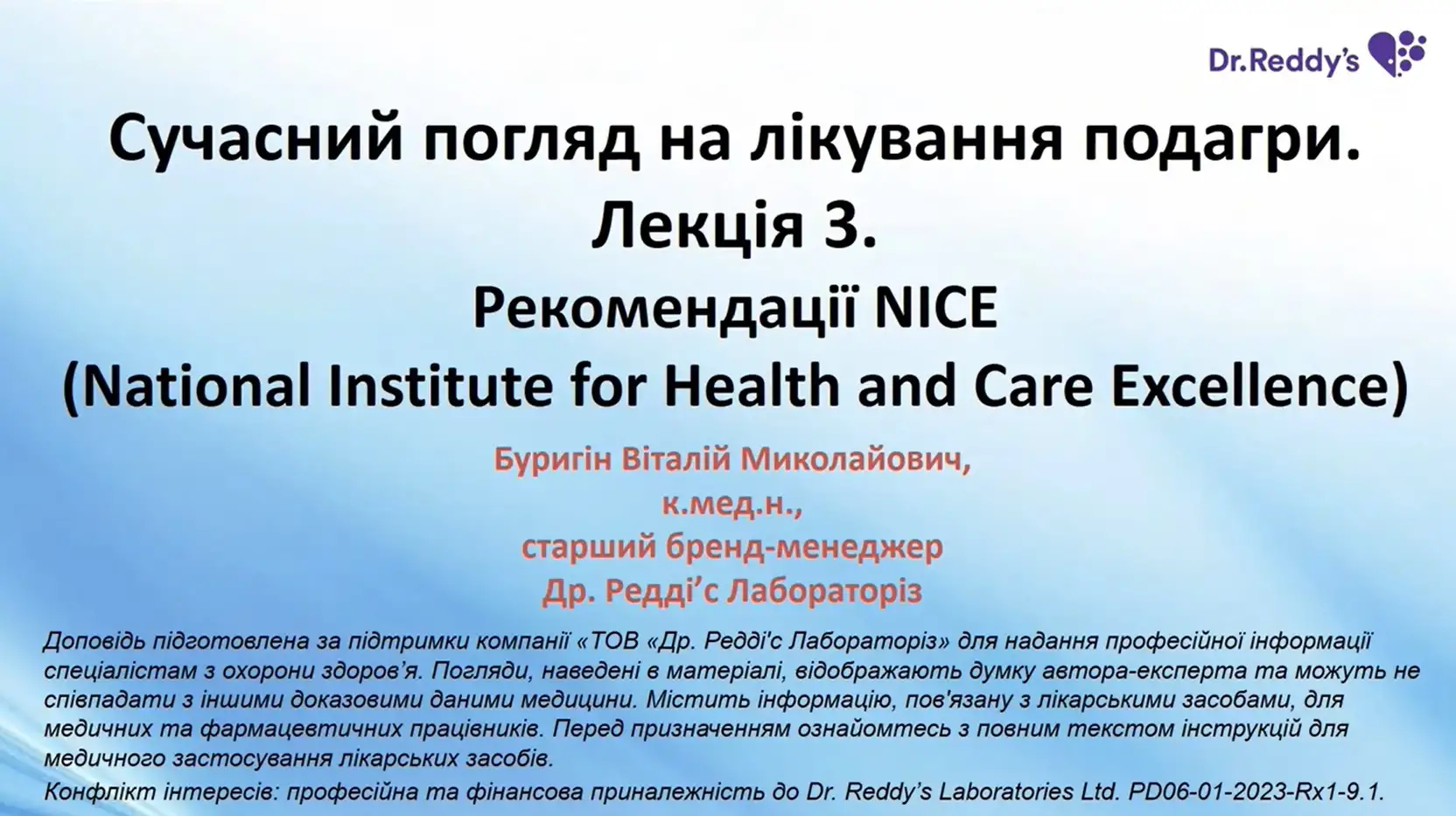 Стратегія лікування «дотримання цільового рівня». Призначення низької дози уратзнижувального препарату з подальшим визначенням рівня СК 1 раз на місяць і титрування дози до досягнення цільового рівня СК. Цільовий рівень СК <360 мкмоль/л (6 мг/дл ).