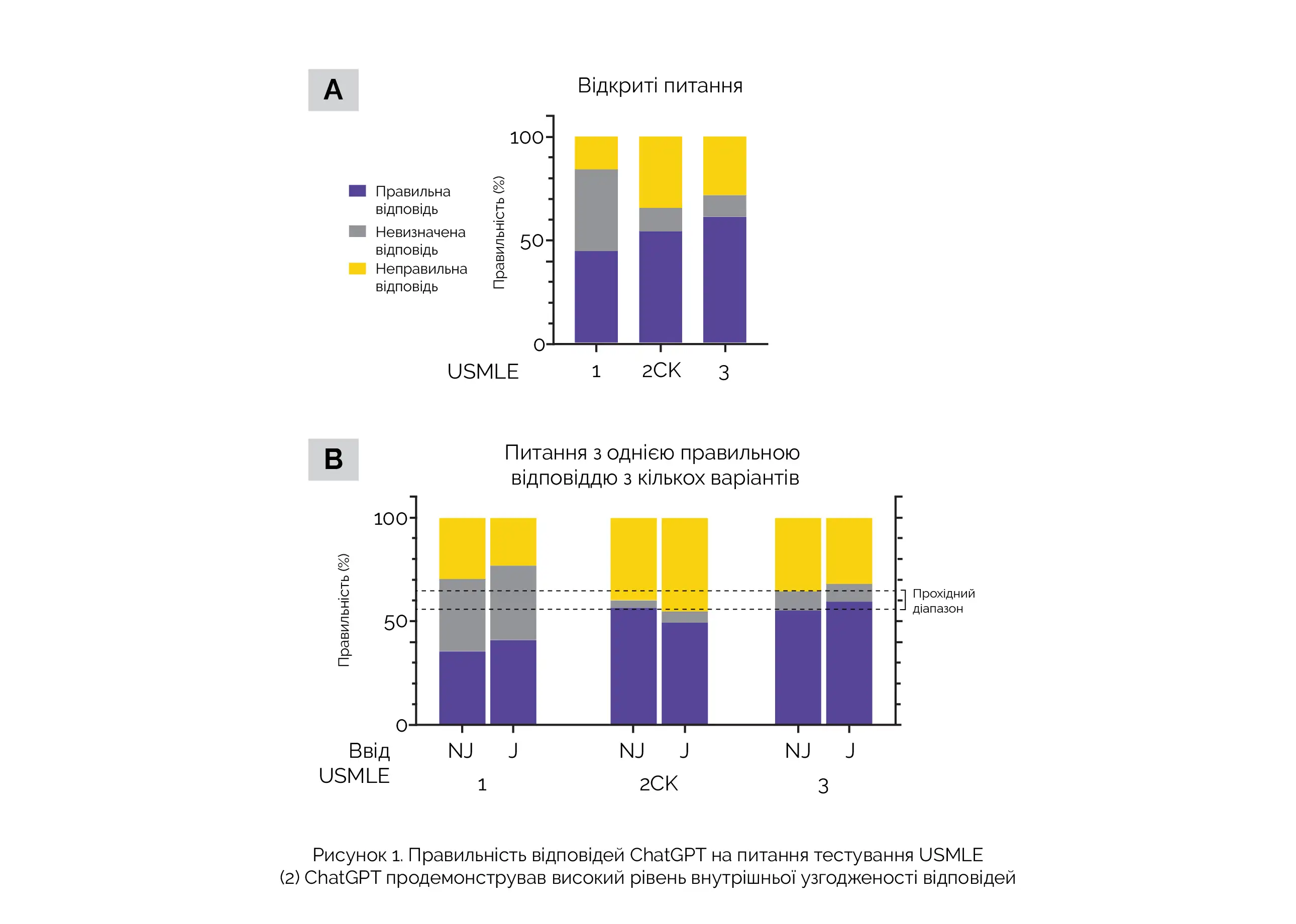 Для оцінки точності відповідей ChatGPT на етапах 1, 2 та 3 тестування USMLE всі відповіді ШІ оцінювали за допомогою системи оцінки правильності, узгодженості та отримання знань (ACI) класифіковані як правильні, неправильні та невизначені. На малюнку 1 представлені результати оцінки точності відповідей ChatGPT у тестуванні USMLE, а саме: (A) розподіл правильності відповідей на введені відкриті питання; В) розподіл правильності відповідей на питання з однією правильною відповіддю з кількох варіантів без обгрунтування (MC-NJ) або із запитом обґрунтування (MC-J).
