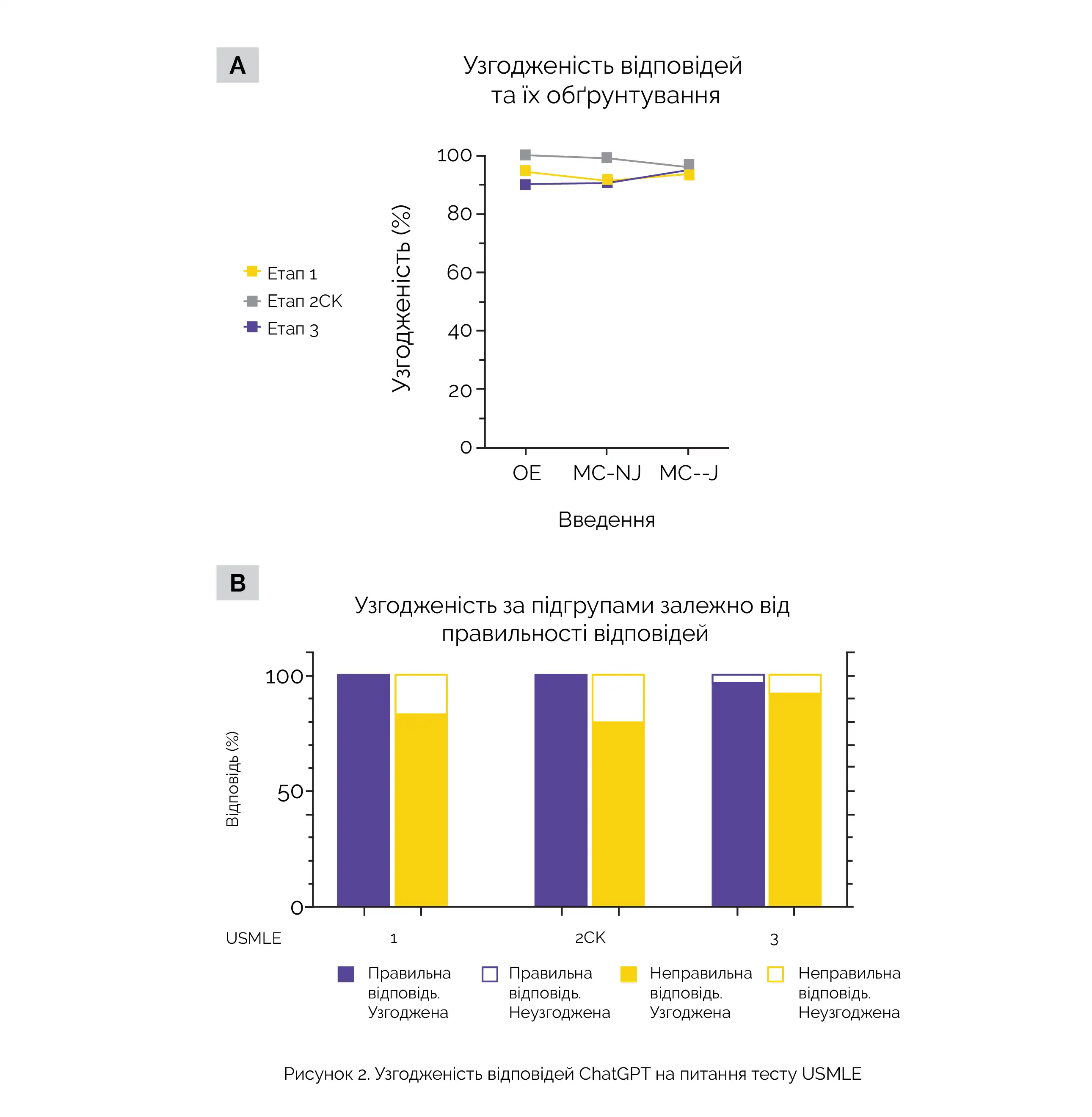 ChatGPT практично подолав пороговий рівень у 60% правильних відповідей на питання USMLE, що означило важливий етап у розвитку технологій ШІ. Слід зазначити, що цього результату було досягнуто без введення спеціальних даних в ChatGPT експертом, який його навчає. Крім того, ChatGPT продемонстрував свою здатність вибудовувати зрозумілі логічні ланцюжки та надавати достовірні клінічні дані, що підвищує обґрунтованість його висновків та довіру до них.