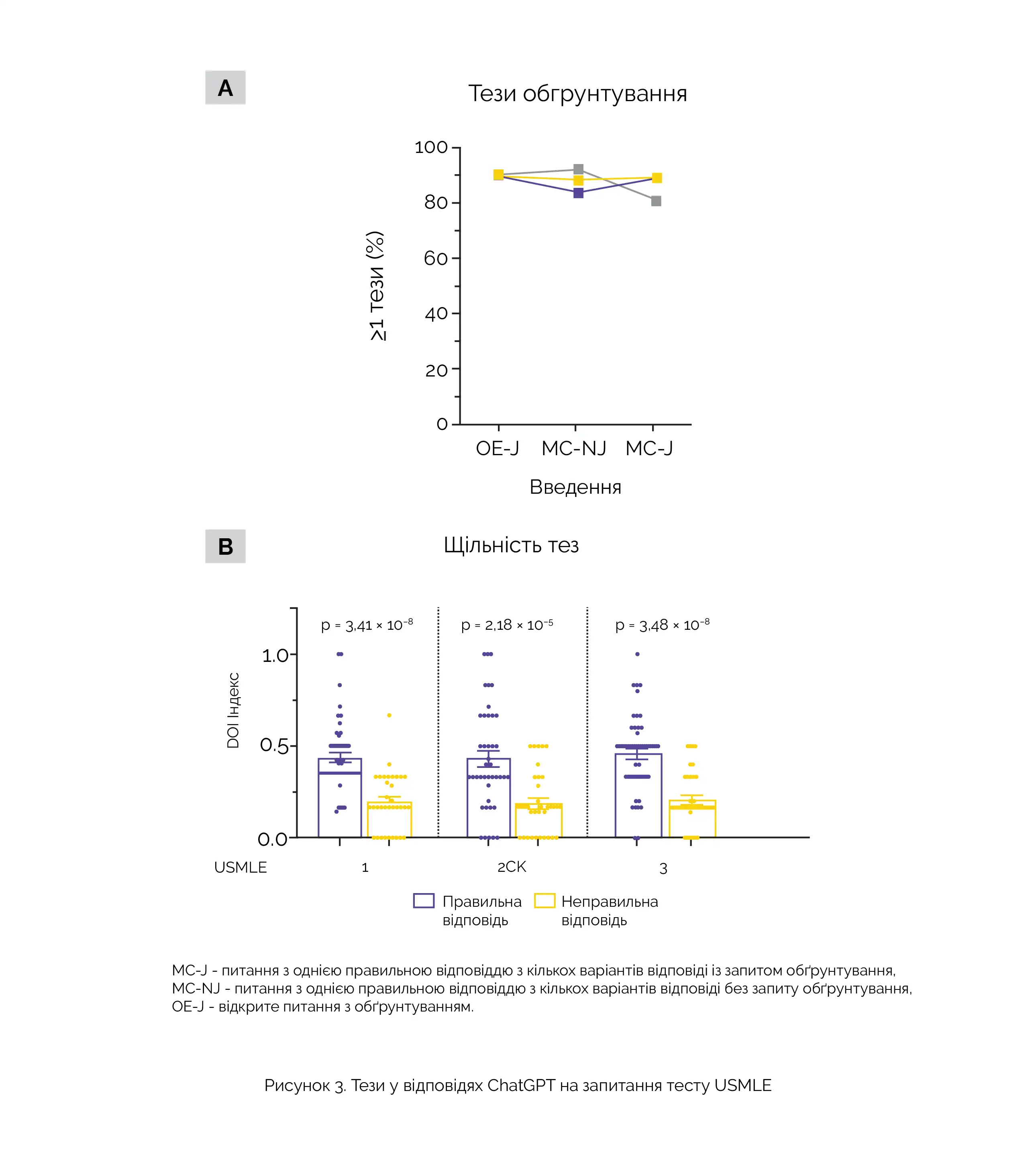 Загалом ChatGPT сформував як мінімум одну значущу тезу в 88,9% всіх відповідей. Частота таких тез залишалася порівняно стабільною незалежно від виду тестування і формату питань. Для всіх видів тестування середня щільність значущих тез у питаннях з правильною відповіддю була значно вищою порівняно з питаннями з неправильними відповідями (0,458 і 0,199). На малюнку 3 показано наступне: (A) поширеність загальних тез, яку визначали як співвідношення відповідей з не менш ніж однією тезою для всіх питань формату MC-J у всіх видах тестування; В) щільність тез, класифікованих як правильні і неправильні для питань формату MC-J у всіх видах тестів.