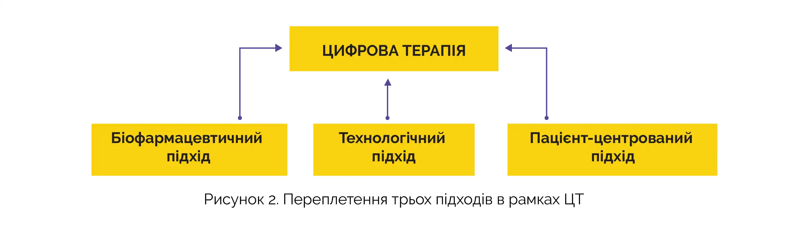 Засоби ЦТ - це новий клас додатків, які допомагають у лікуванні різних захворювань шляхом віддаленого спостереження за пацієнтами [3]. Мета застосування цих цифрових терапевтичних засобів — залучення пацієнтів до індивідуальних програм лікування чи профілактики захворювань, які сприяють досягненню поведінкових та психологічних змін, збереженню мотивації та покращенню способу життя [13]. Програми, що використовуються в рамках ЦТ, розроблені для досягнення сприятливих довгострокових результатів лікування; наприклад, такі програми допомагають пацієнтам дотримуватися певної дієти та програми фізичних вправ, а також режиму застосування лікарських препаратів [3]. ЦТ заснована на трьох підходах: біофармацевтичному, пацієнт-центрованому та технологічному (див. рисунок 2).