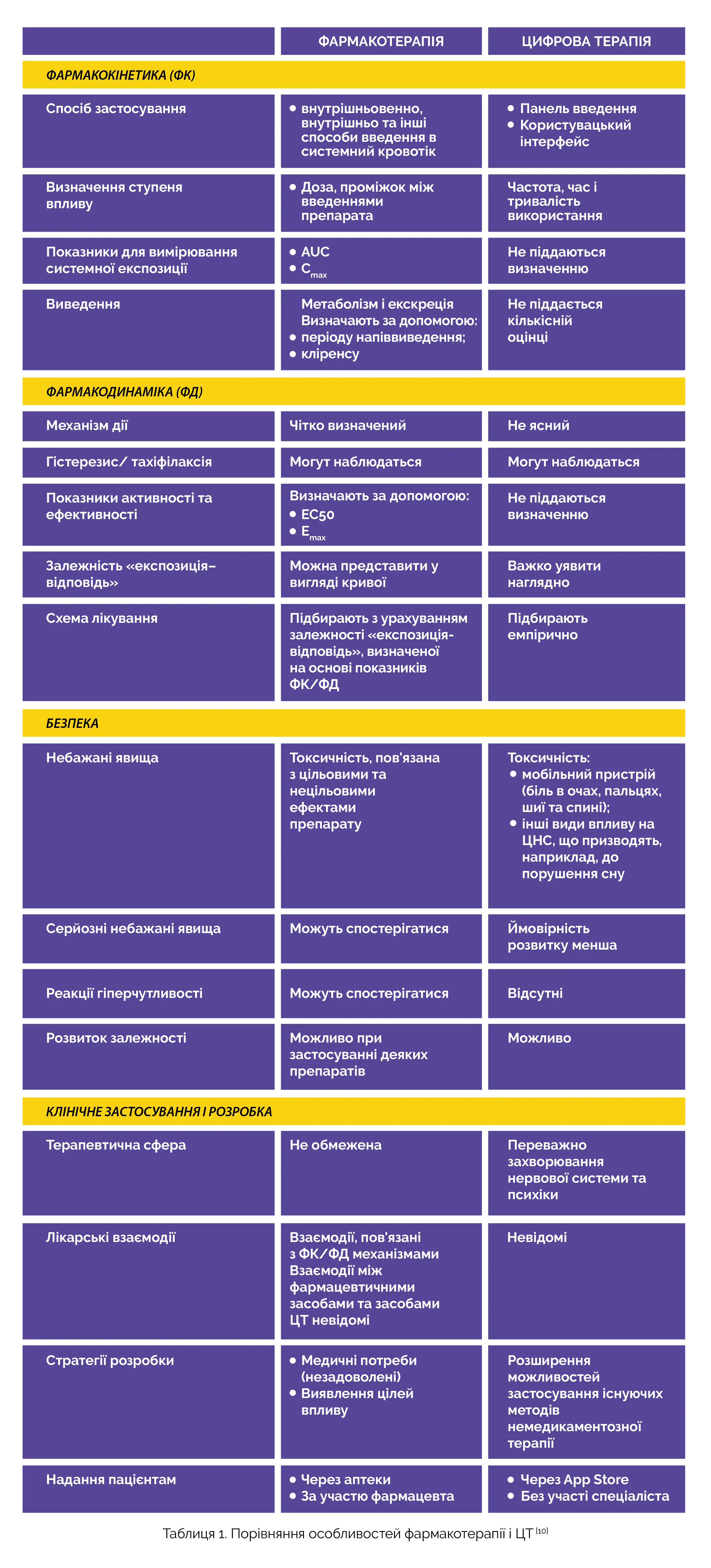 На відміну від фармацевтичних засобів, які передбачають введення певної речовини в організм, застосування засобів ЦТ залежить від зовнішніх факторів, таких як надійне підключення до Інтернету, наявність відповідного мобільного пристрою та впевнених навичок користувача. Таким чином, доступ до засобів ЦТ можна отримати лише за наявності технічних пристроїв та навичок роботи з ними, що вказує на потенційно вибірковий підхід при роботі з пацієнтами [2]. Принципова відмінність засобів ЦТ від ліків полягає в тому, що терапевтичні ефекти від застосування перших виникають без присутності активної речовини в системному кровотоку. Аналіз принципів фармакотерапії порівняно з принципами ЦТ з погляду клінічної фармакології наведено у таблиці 1.