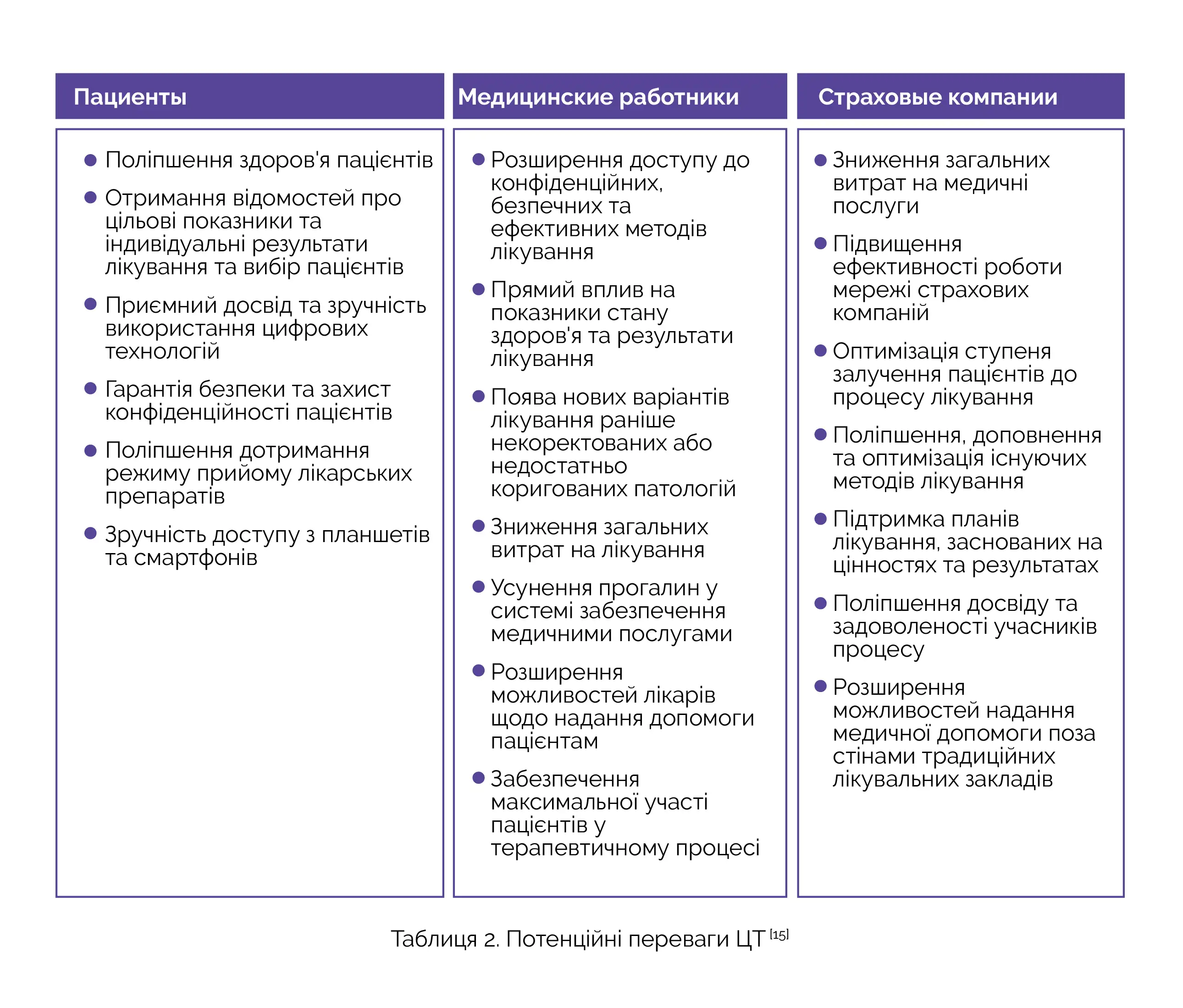 Ці високотехнологічні програми допомагають зберігати мотивацію пацієнтів до дотримання затверджених планів лікування, дієт та програм фізичних вправ. Використання програмного забезпечення, що лягло в основу засобів ЦТ, має бути підтверджено точними та надійними науковими доказами, що свідчать про можливість його ефективного застосування для профілактики та лікування захворювань [19]. ЦТ також забезпечує більш тісне співробітництво між пацієнтами, страховими компаніями та постачальниками медичних послуг для розробки новаторських підходів до покращення медичного обслуговування [20]. Застосування ЦТ може принести користь пацієнтам, медичним працівникам та страховим компаніям у різні способи, які перераховані в таблиці 2 [19].