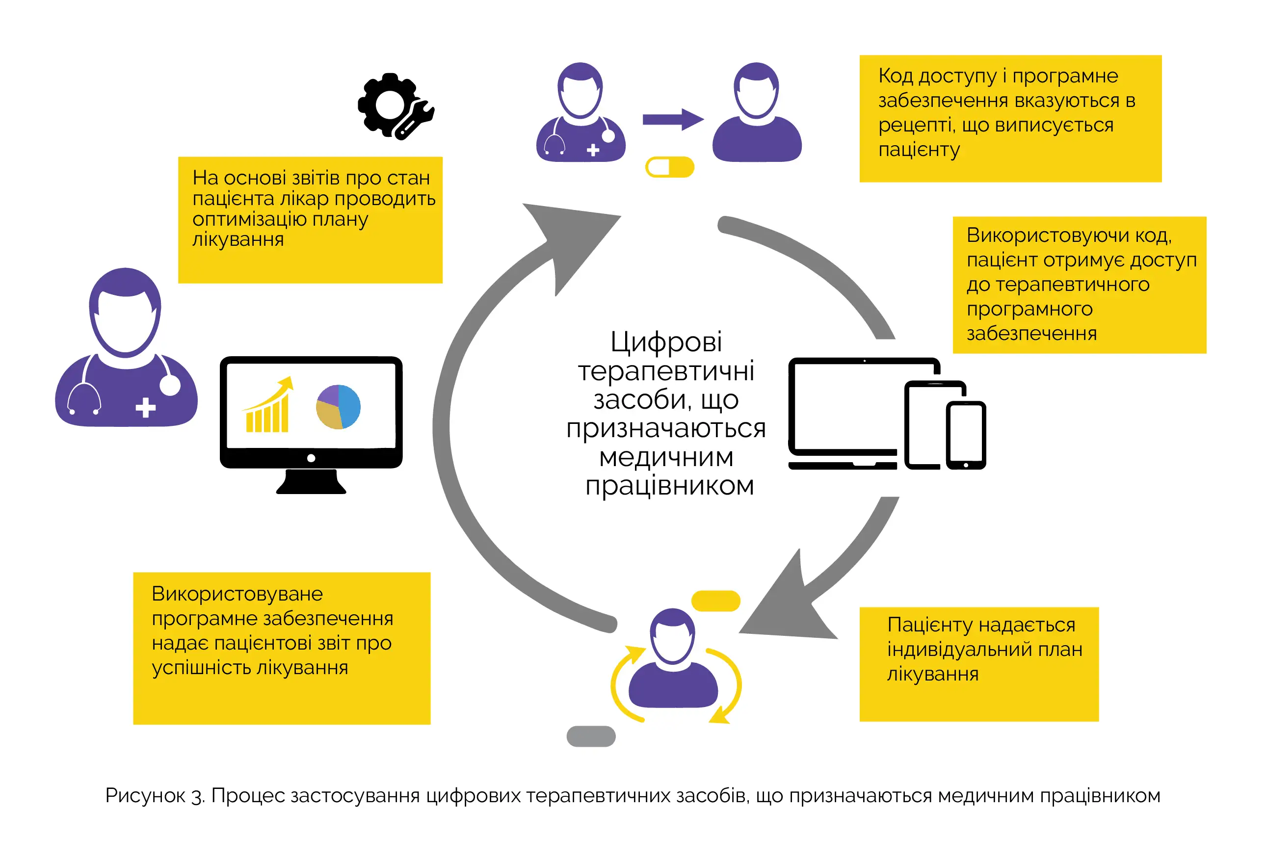 Отримані дані та результати аналізів - безцінне джерело для поліпшення комерційних та клінічних показників, а також результатів лікування [14]. Засоби ЦТ — це «розумні» інструменти, доступні для страхових компаній, пацієнтів та медичних працівників, які дозволяють лікувати широкий спектр захворювань шляхом різних втручань, що базуються на отриманих даних. Незважаючи на те, що ЦТ є фундаментальною складовою цифрової охорони здоров'я, вона відрізняється від телемедицини, цифрової діагностики та різних засобів цифрової охорони здоров'я [15]. Програми, що використовуються в рамках ЦТ, розроблені для корекції конкретних патологічних станів, особливо тяжких хронічних порушень, таких як цукровий діабет, неврологічні розлади, легеневі та серцево-судинні захворювання. На рисунку 3 проілюстровано процес застосування цифрових терапевтичних засобів, що призначаються медичним працівником.