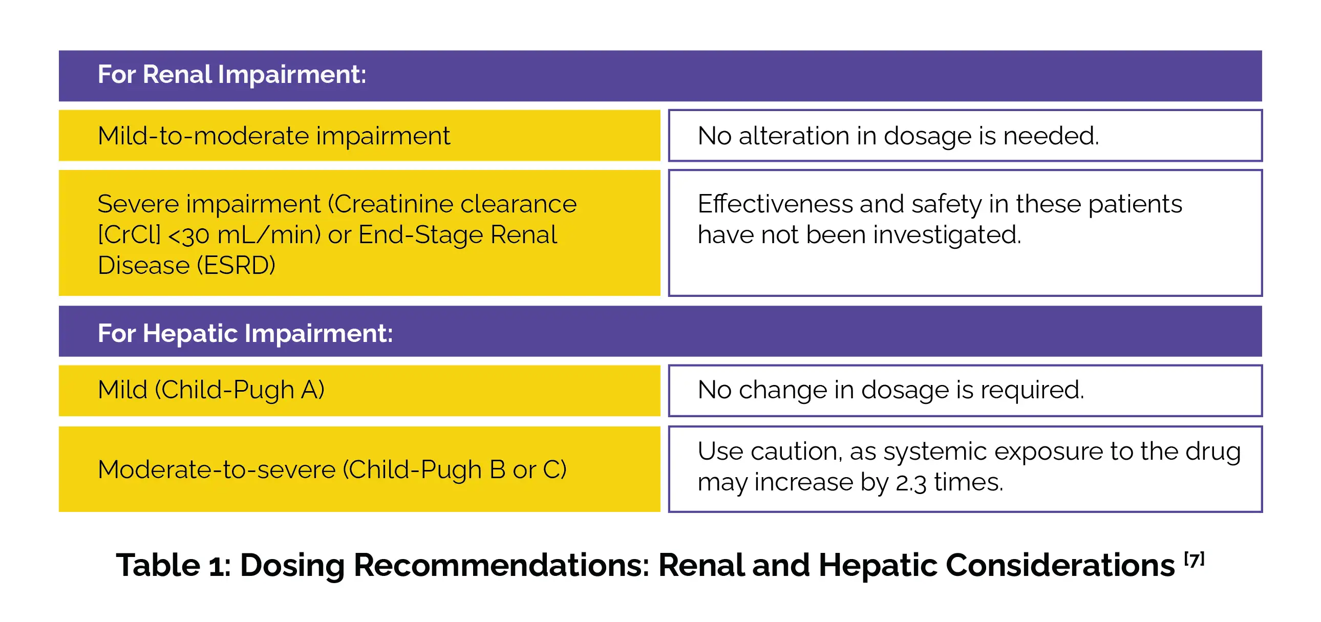 Dosage Modifications: Table 1 summarizes dosage adjustments in renal and hepatic dysfunction.