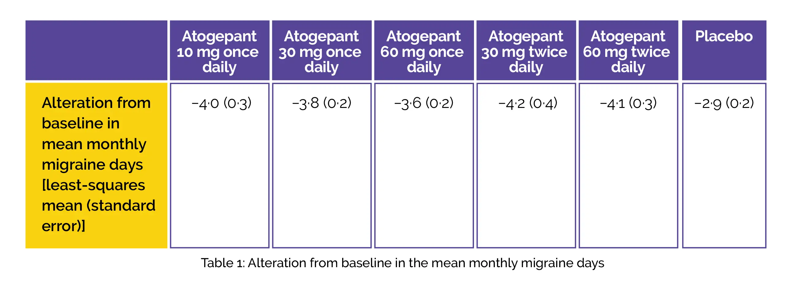 A phase 2b/3 double-blind randomized trial demonstrated that all the doses of oral atogepant (10 mg once daily, 30 mg once daily, 60 mg once daily, 30 mg twice daily, 60 mg twice daily) were linked with a considerable reduction in the monthly migraine days over twelve weeks in comparison with placebo. It was safe and showed good tolerability over twelve weeks, supporting its phase III development for the preventive therapy of migraine.