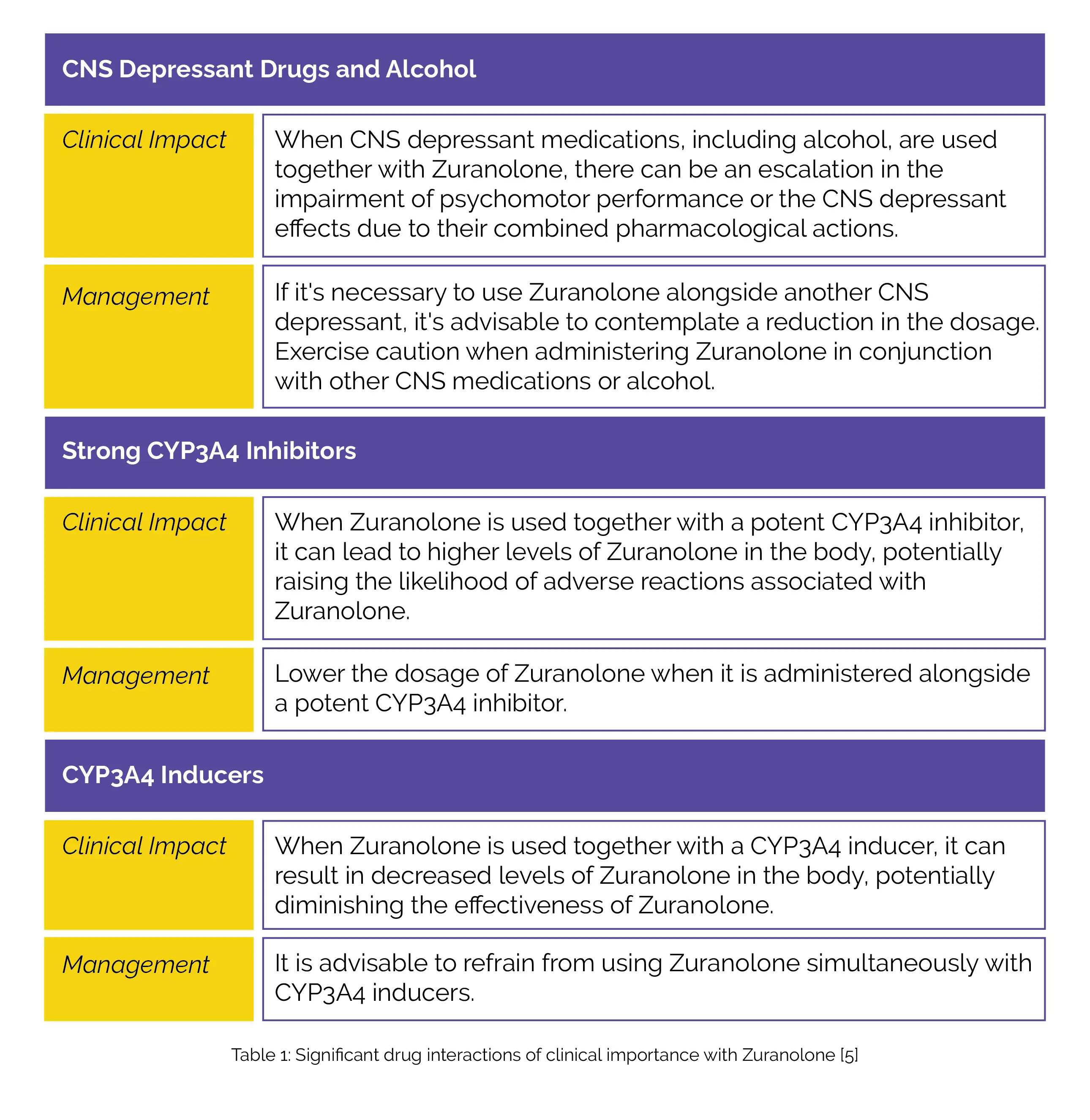 Table 1 illustrates clinically important drug interactions with Zuranolone.