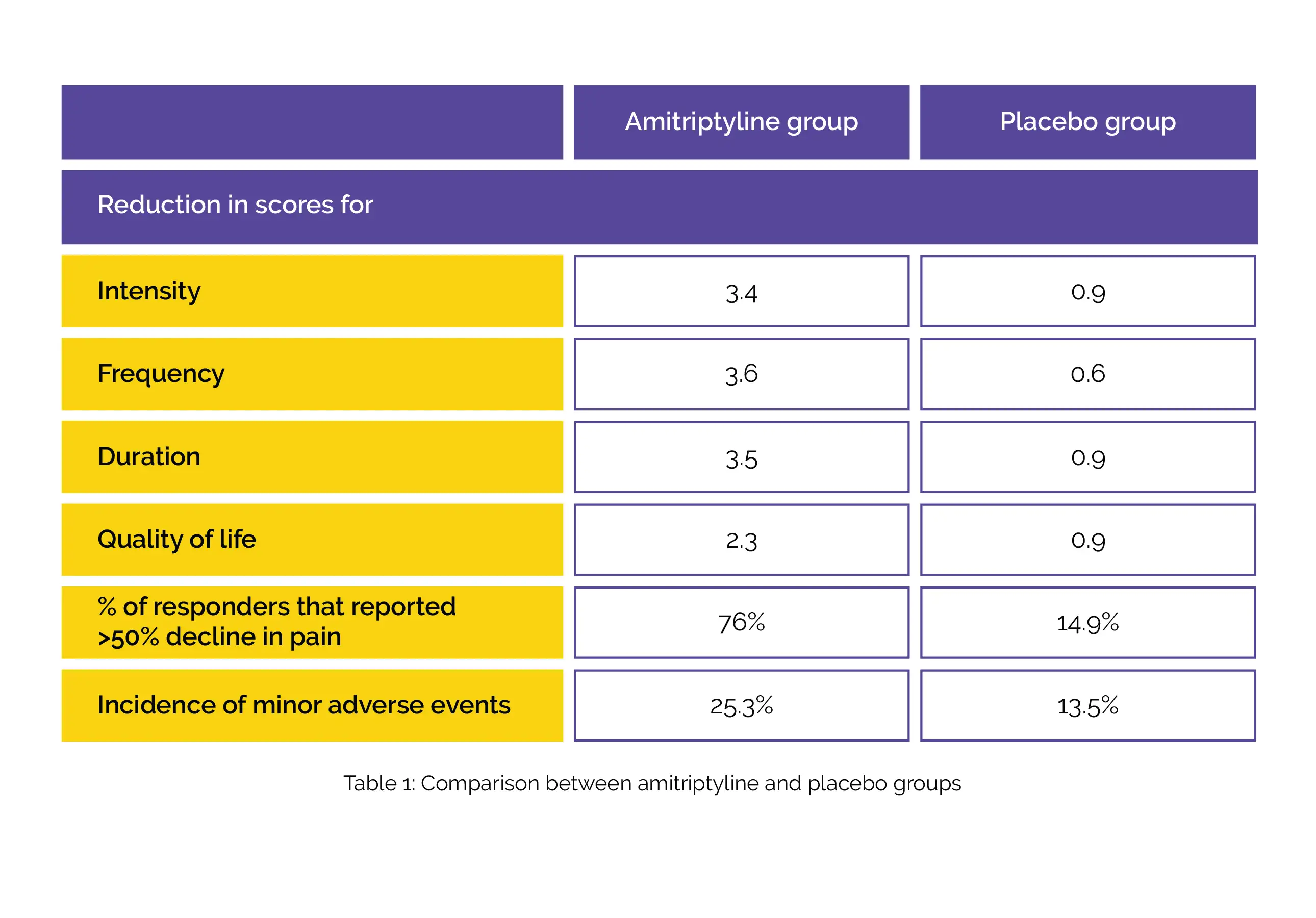 A substantial inter-group difference was noted in pain relief in terms of decline in scores for intensity, frequency, duration, and quality of life. In the amitriptyline group, a greater percentage of responders reported >50% decline in pain when compared to the placebo group. The occurrence of minor adverse events was similar between the groups, as illustrated in Table 1: