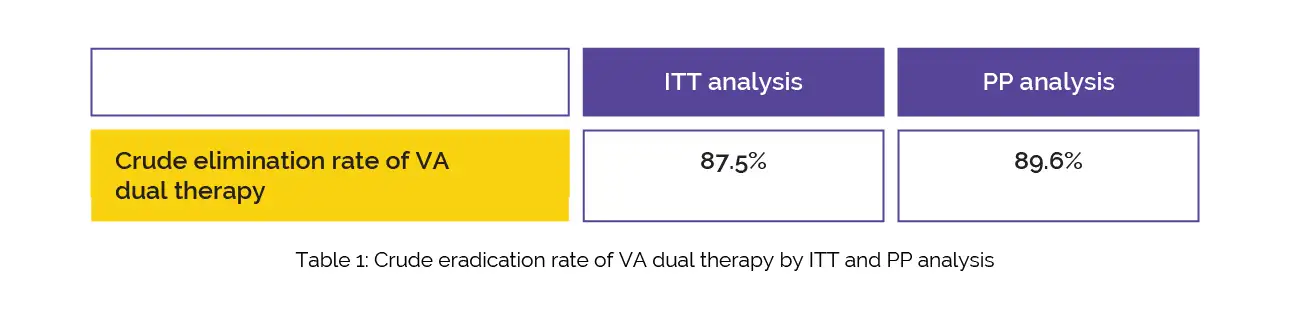 According to the per-protocol (PP) and intention to treat (ITT) assessment, the crude elimination rate of VA dual treatment is depicted in Table 1: