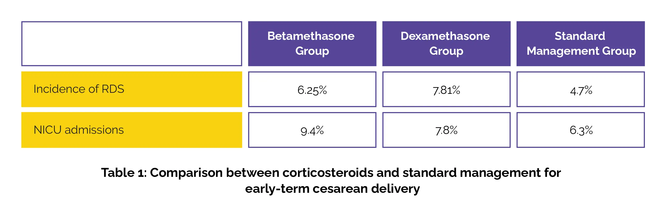 The benefits of antenatal corticosteroids before early-term cesarean sections are uncertain, with inconclusive evidence on reducing respiratory issues. This study by Namita Gupta et al. assessed the effectiveness and safety of intramuscular administration of Dexamethasone and Betamethasone phosphate in comparison to standard care for preterm newborns. After screening 241 pregnant women undergoing C-sections for eligibility criteria, 192 pregnant women undergoing early-term C-sections were considered and divided into three groups—receiving either Betamethasone, Dexamethasone or no corticosteroids (standard management protocol).
