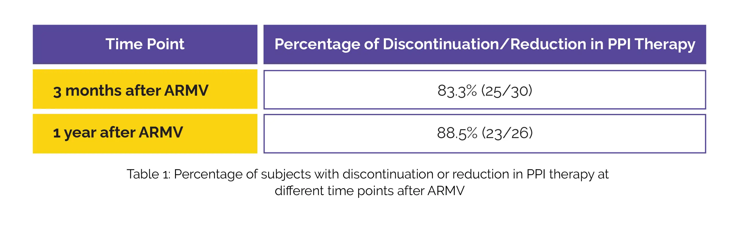All 30 ARMV procedures were carried out successfully, with a mean operation duration of 72.6±20.3 minutes. One patient experienced post-operative bleeding necessitating endoscopic hemostasis. The mean follow-up period was 28.9±13.9 months. At 3 months and 1 year following ARMV, either reduction or discontinuation in proton pump inhibitor (PPI) therapy was noted in the majority of subjects (Table 1).
