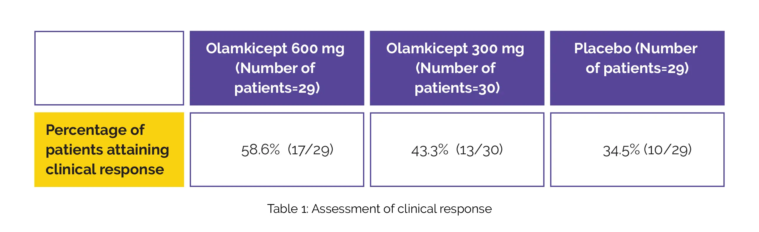 Out of the total, 79 (86.8%) accomplished the study. At week 12, more patients receiving Olamkicept 600 mg or 300 mg achieved clinical response than placebo, with adjusted difference vs placebo of 26.6% for 600 mg and 8.3% for 300 mg. Details of the clinical response achieved at week 12 are shown in the following Table 1: