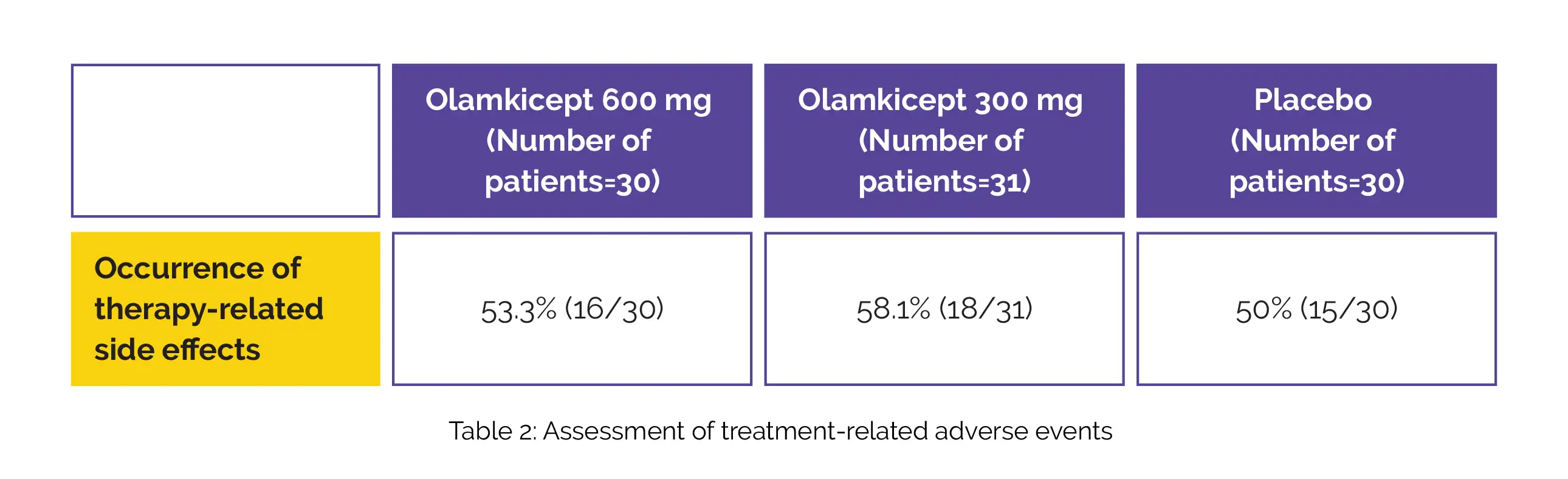 Sixteen out of 25 secondary outcomes were statistically noteworthy in patients who received Olamkicept 600 mg compared with placebo.  Among participants randomly allocated to get 300 mg, 6 of 25 secondary outcomes were statistically significant in comparison with placebo. The percentage of people experiencing treatment-related adverse events is shown in Table 2: