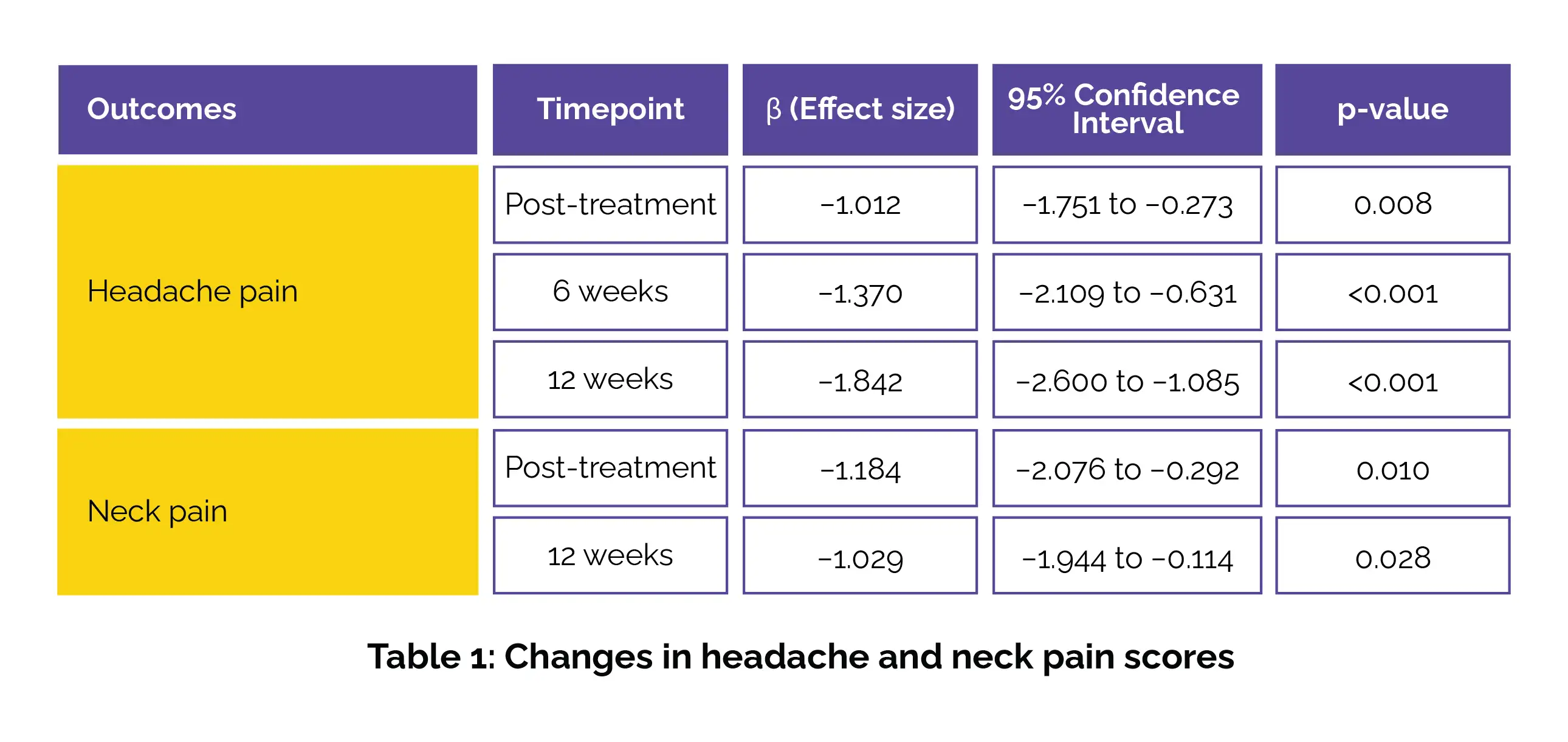 Exploratory analysis showed noteworthy improvements over time in average headache pain and neck pain among those who received active stimulation compared to those in the sham group. These benefits were observed from pre- to post-treatment and continued through follow-up at 6 and 12 weeks, indicating a sustained therapeutic effect of the combined intervention (Table 1).