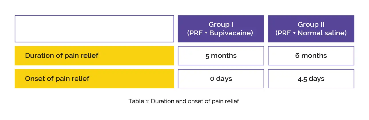Group II underwent the same procedure and was then administered a 1 ml injection of normal saline. Outcomes included analgesic effect, pain onset time, and pain alleviation duration as measured by a numerical pain rating scale. A similar duration of pain alleviation was noted in both groups. People in Group I had a faster onset of pain alleviation than patients in Group II, as shown in Table 1: