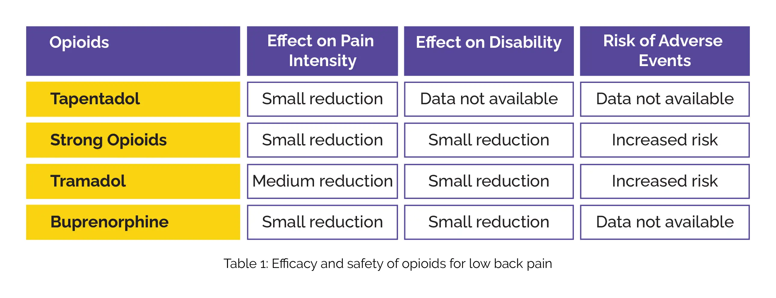 Considering safety, opioids (all types) showed low-certainty evidence of a small increased risk of adverse events, including nausea, headaches, constipation, and dizziness compared to placebo. The results suggest that Tapentadol and strong opioids might offer some relief for low back pain, but caution is advised due to the increased risk of adverse events associated with opioids.