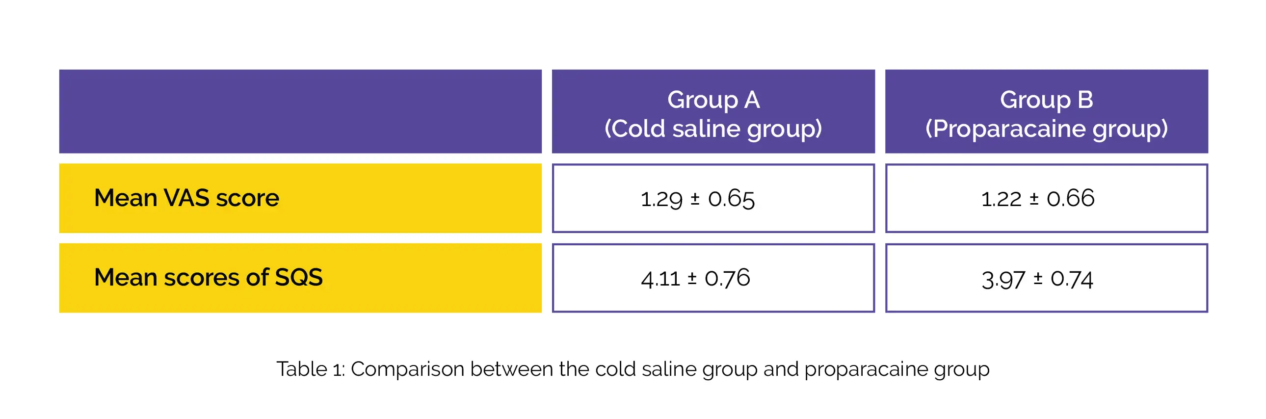 Hence, the cold saline solution appears to be a promising substitute to topical ophthalmic proparacaine for the maintenance of topical anesthesia.