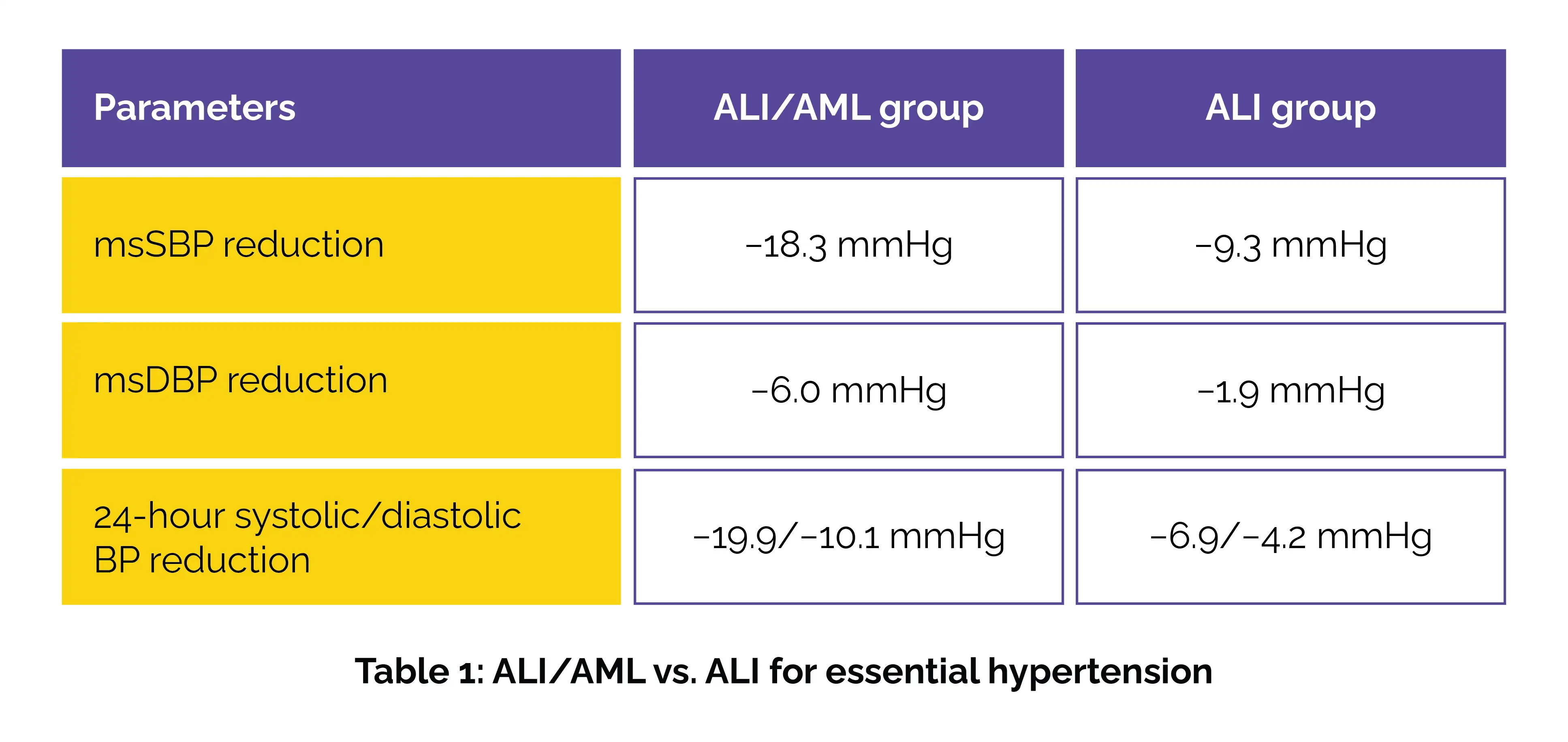 This phase was followed by a 40-week open-label extension, during which all patients received the ALI/AML combination, allowing long-term evaluation of effectiveness and safety. Results showed a substantially greater reduction in msSBP and msDBP at week 12 in the ALI/AML group when compared to the ALI group. Ambulatory BP monitoring further supported these findings, showing greater 24-hour systolic/diastolic BP reductions in the combination group (Table 1).