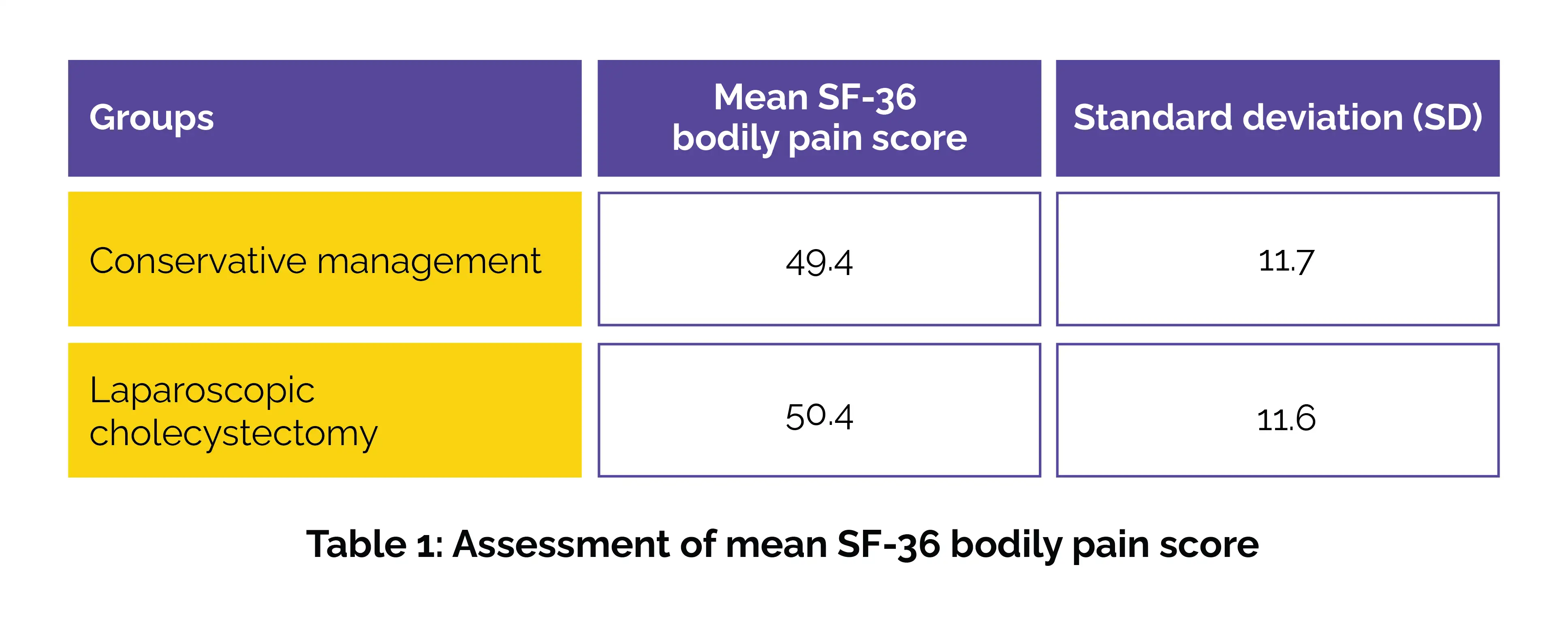 In contrast, the cholecystectomy group underwent laparoscopic removal of the gallbladder. By 18 months, 25% of the conservative management group (54 subjects) and 67% of the surgery group (146 subjects) had received surgery. The primary endpoint was quality of life, estimated via the short form 36 (SF-36) bodily pain domain over 18 months. The mean SF-36 bodily pain score was comparable for the conservative and the surgery group (Table 1):