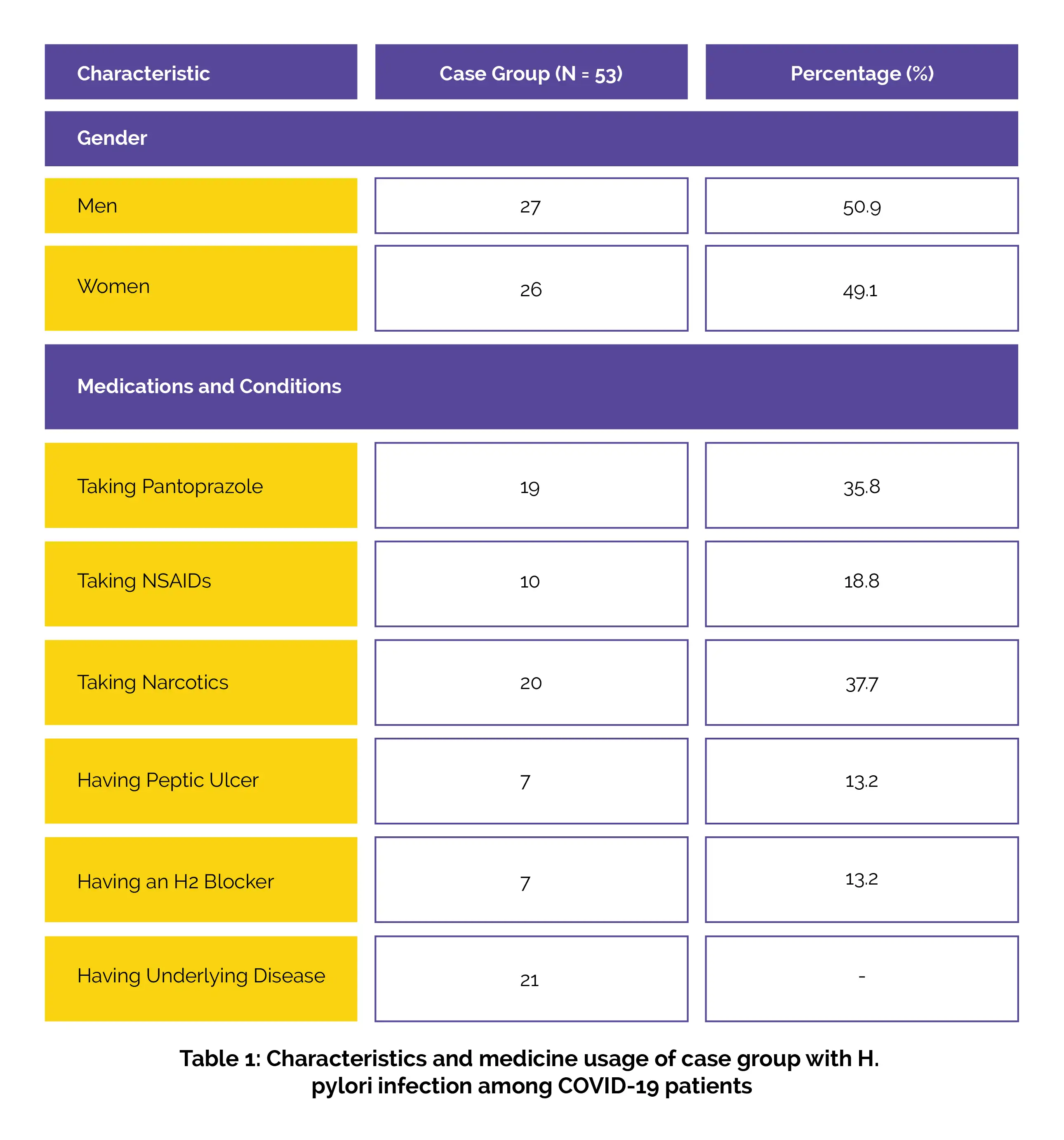 Researchers found that 55.8% of patients with GI symptoms tested positive for H. pylori, compared to 50.5% in those without GI symptoms. In the case group of 53, a noteworthy link was found between H. pylori infection and the usage of Pantoprazole, narcotics, nonsteroidal anti-inflammatory drugs (NSAIDs), peptic ulcers, underlying conditions, and H2 blockers in coronavirus-infected patients (P-value < 0.05), refer to Table 1: