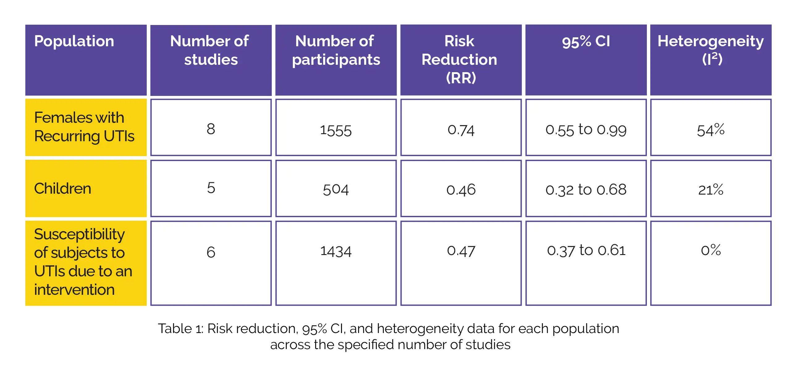 In cases where evidence certainty was moderate, it was found that cranberry products decreased the overall risk of UTIs (6211 participants: Risk Ratio [RR] 0.70, 95% confidence interval [CI] 0.58 to 0.84; I² = 69%). When examining specific participant groups, cranberry products were likely to reduce the risk of UTIs as shown below (Table 1):