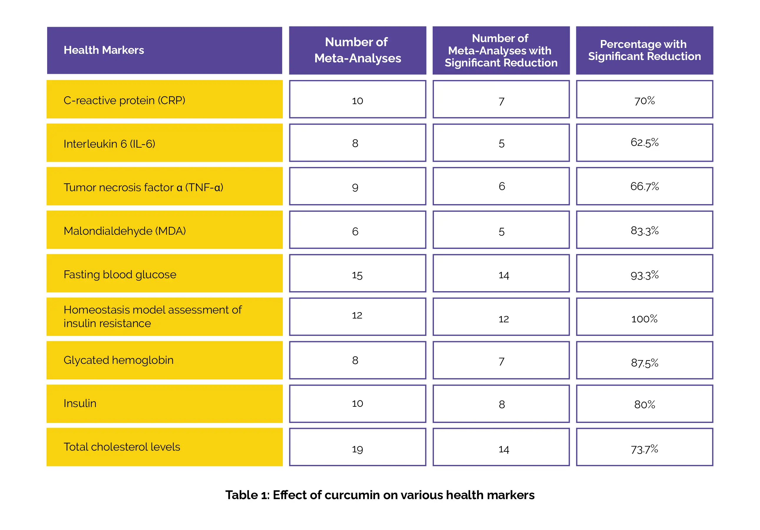 Below in Table 1 summarizes the effects of curcumin based on meta-analyses of RCTs: