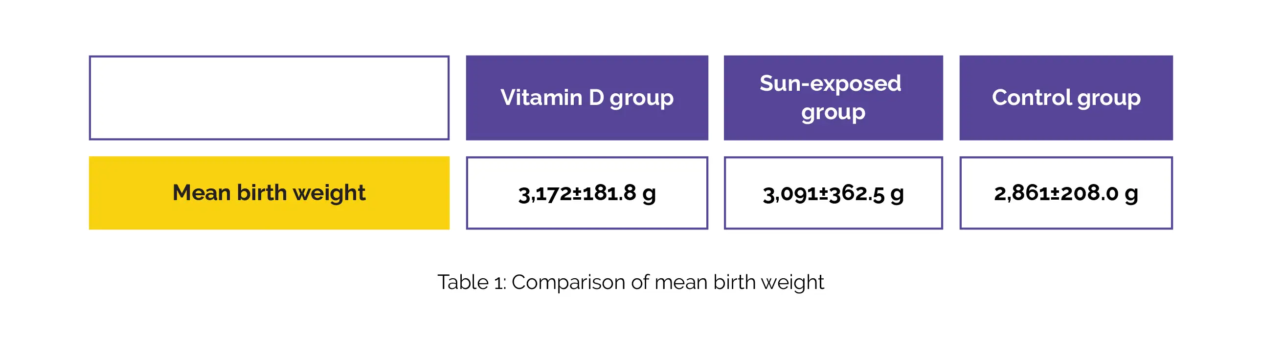 The most notable finding was the positive impact on newborns. The Vitamin D group had the highest mean birth weight when compared to the sun-exposed and control groups, as shown in Table 1: