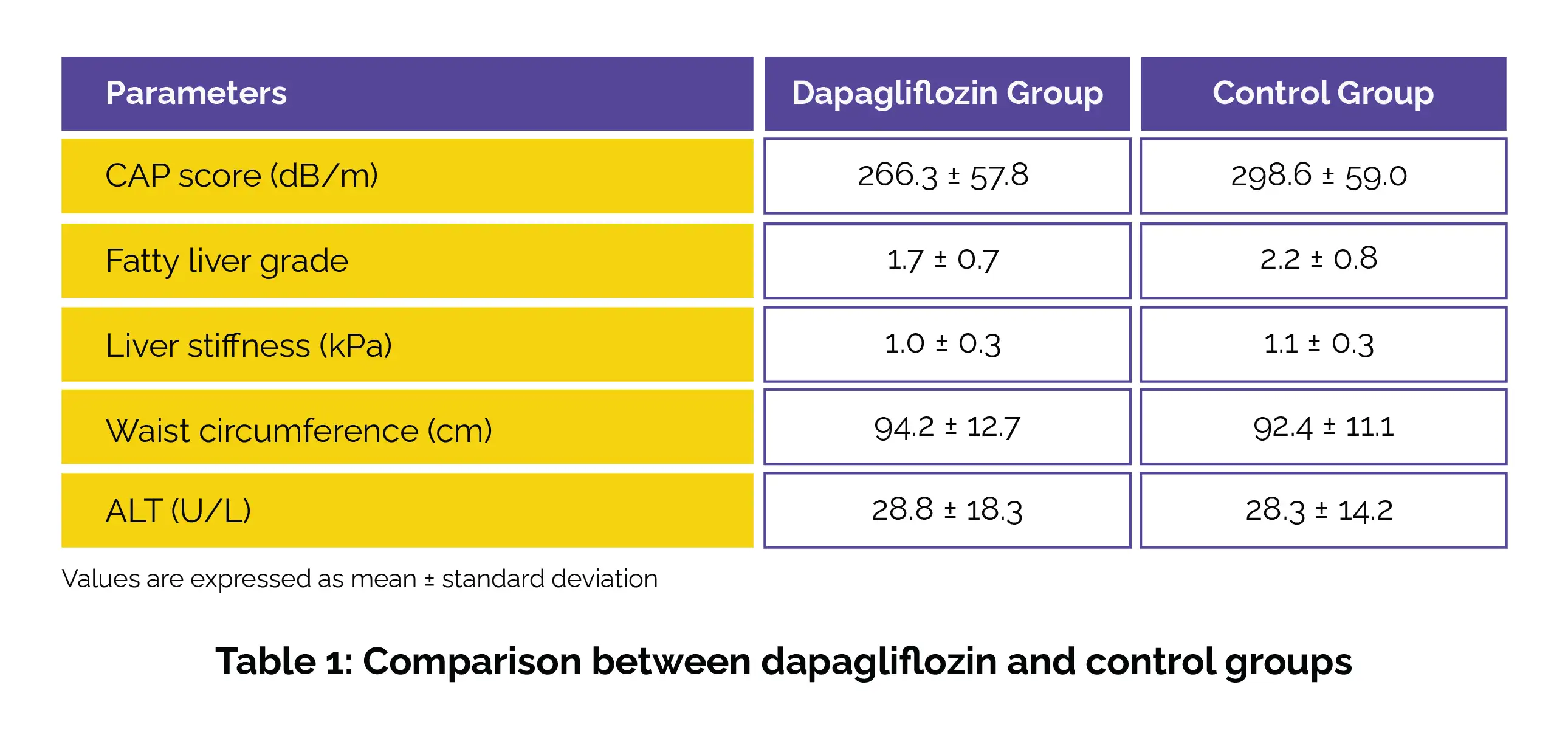In this randomized controlled trial, the dapagliflozin group experienced a remarkable reduction in CAP scores and fatty liver grade when compared to the control group. Though liver stiffness, waist circumference, and alanine transaminase (ALT) levels decreased in both groups, the differences were not statistically significant (Table 1).