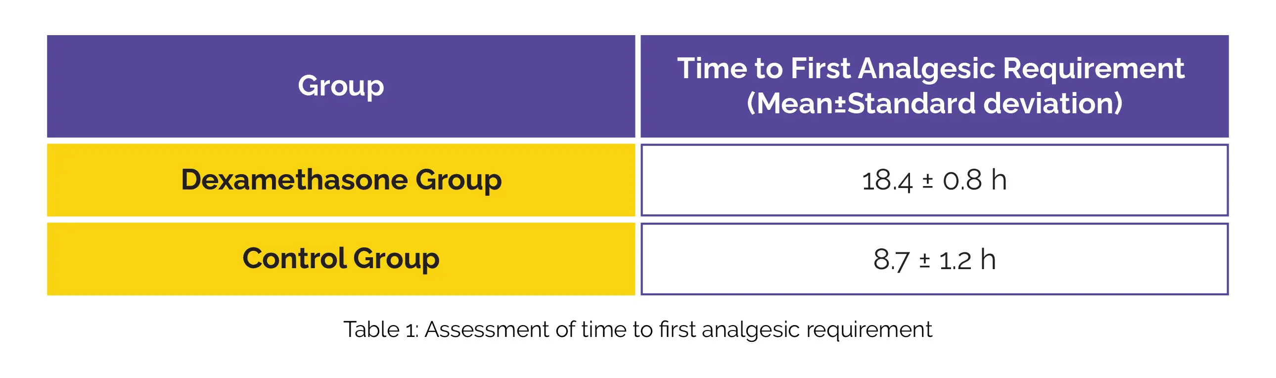 The major endpoint was the time to first analgesic need, while secondary endpoints incorporated the occurrence of side effects, the visual analog scale (VAS) for pain assessment (ranging from 0 to 10), and total opioid consumption within the initial 24 hours post-surgery. Patients in the Dexamethasone-treated group experienced a significantly longer mean time until their first need for analgesics compared to those in the control group (Table 1).
