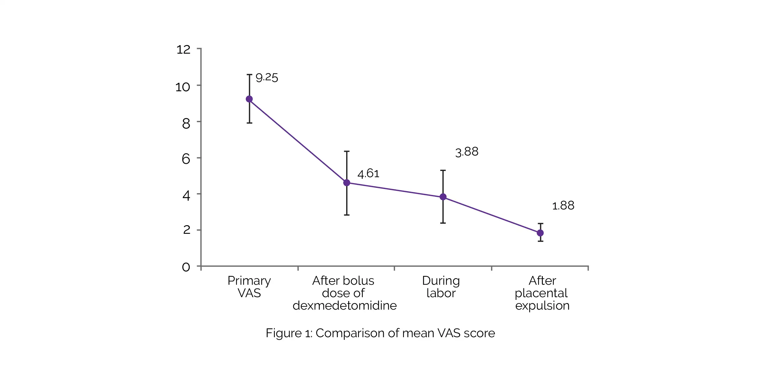 The intervention group's active phase of labor was noticeably shorter than that of the control group. Following Dexmedetomidine use, the mean Visual Analogue Scale (VAS) score dramatically dropped from 9.25 at baseline to 4.61 after medication administration, 3.88 throughout labor, and 1.88 after placental ejection, as shown in Figure 1: