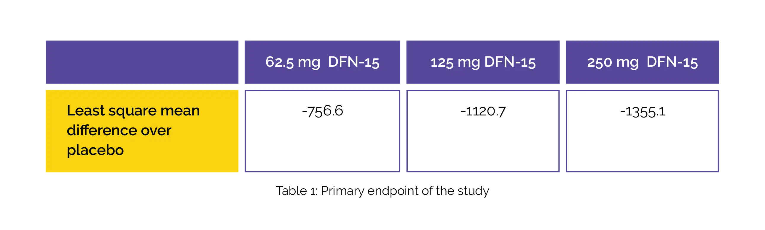Utilizing the analysis of covariance, the summed pain intensity difference (SPID, major outcome) over six-hour postdose period (SPID6) was evaluated between each dose of DNF-15 and placebo. The usage of rescue medication, safety, and pain reduction were also analyzed. In terms of SPID6, DFN-15 (all three doses) was superior to placebo, as shown in Table 1: