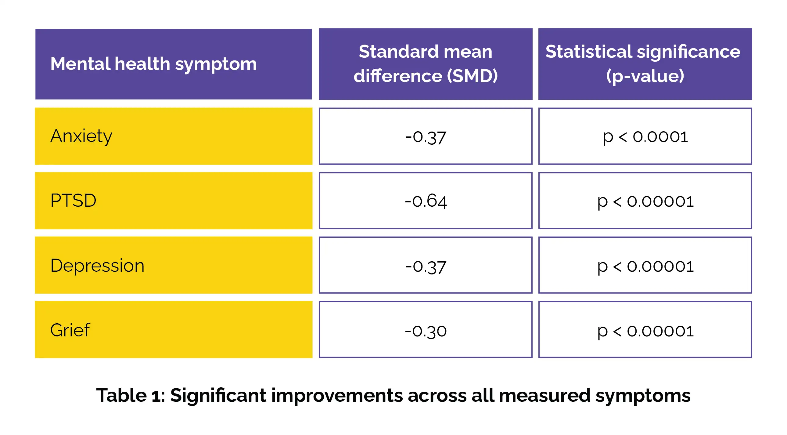 Danyang Yao and colleagues reviewed data from nearly 1,500 participants across multiple randomized controlled trials sourced from major medical databases. The study analyzed data from 726 people in the intervention/treatment group and 771 in the control group. After the web-based grief therapy, participants showed notable improvements across multiple mental health symptoms (Table 1), all with statistically significant results.