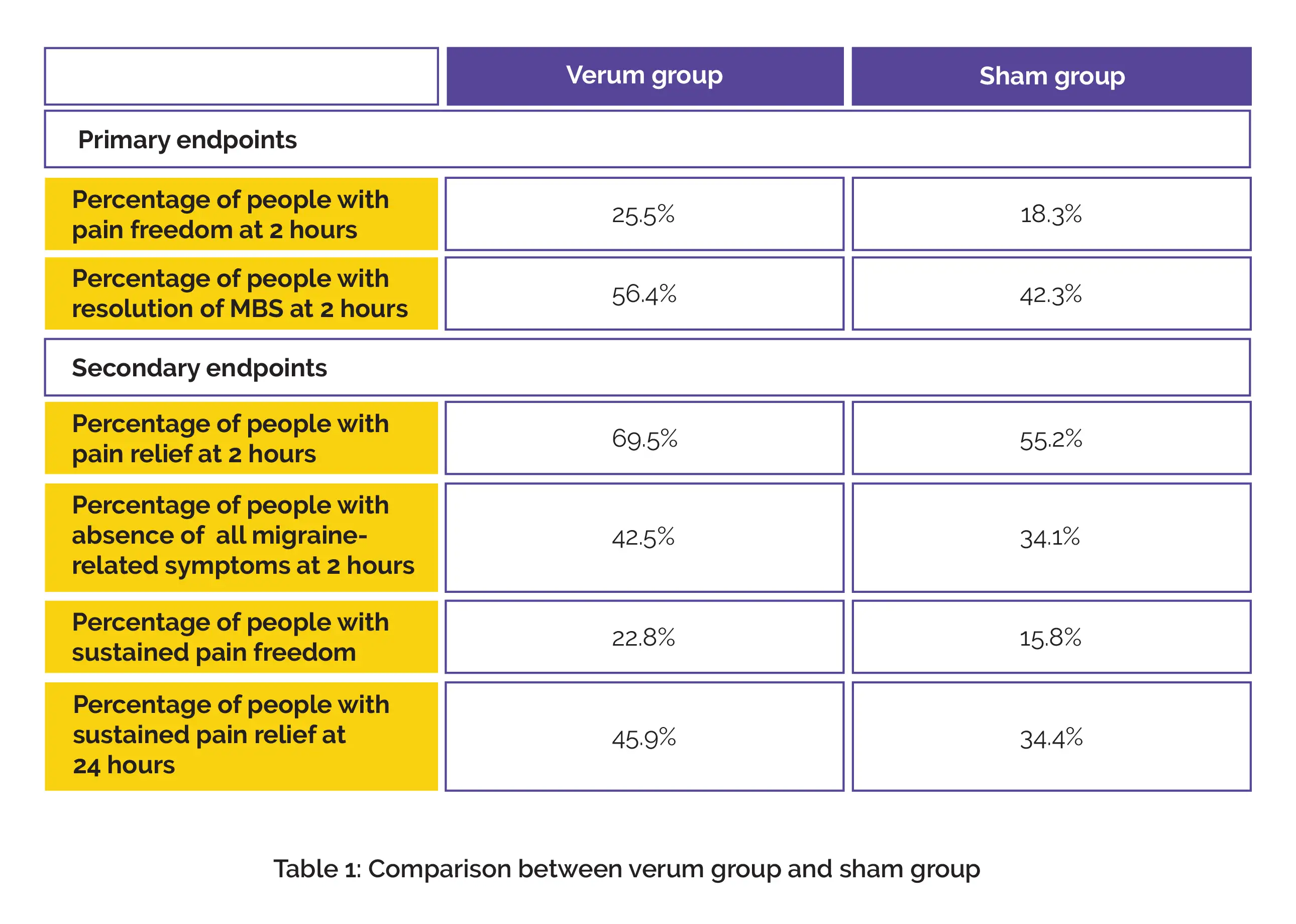 Regarding secondary endpoints, the verum group exhibited 14.3% more pain mitigation at 2 hours, 8.4% higher absence of all migraine-associated symptoms at 2 hours, 7.0% more sustained pain freedom, and 11.5% higher sustained pain relief at 24 hours when compared to the sham group, as shown in Table 1: