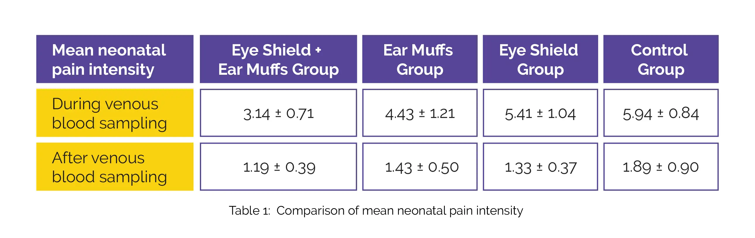In a clinical trial, the concomitant use of ear muffs and eye shields during painful procedures reduced infants' pain more effectively than each intervention alone. When collecting preterm infants' venous blood, researchers wanted to determine the impact of an eye cover and ear muffs on the intensity of pain.