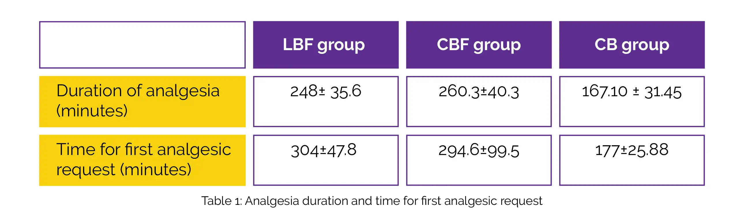 Duration of analgesia and time for the first analgesic request was significantly longer in LBF and CBF groups when compared to CB group, as shown in Table 1: