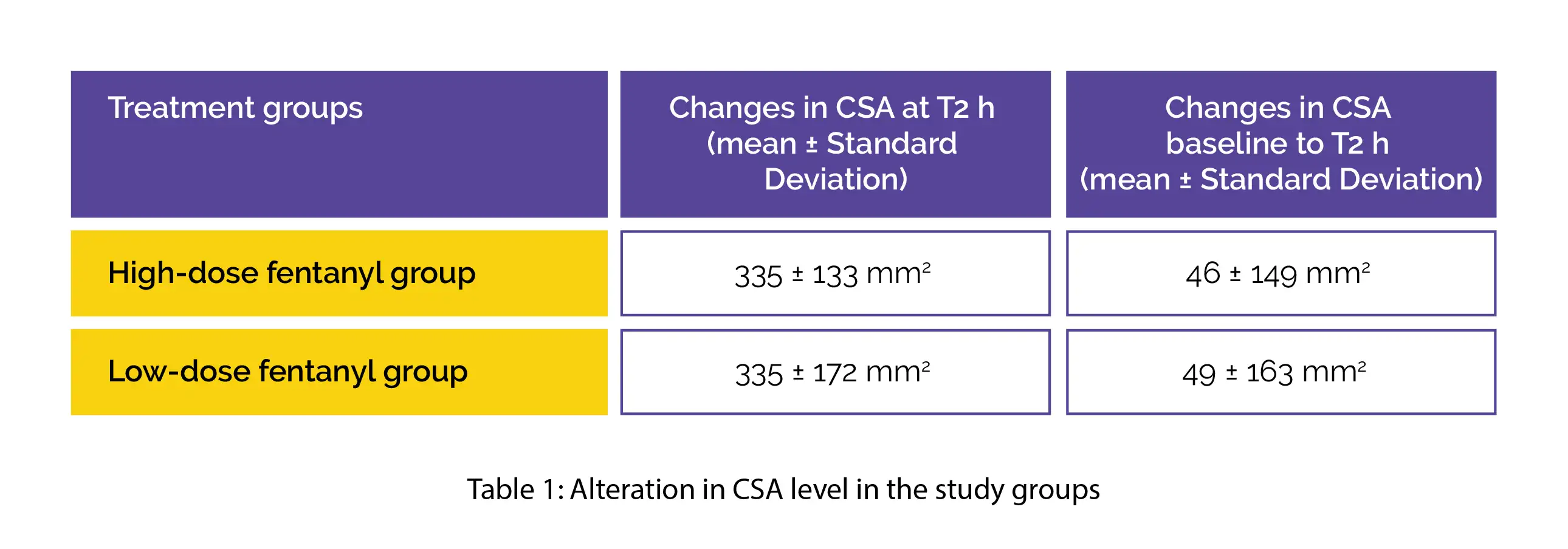 A comparison of the stomach content at T2 h was done in subgroup analysis according to the baseline, high dose vs low dose fentanyl, empty (CSA <381 mm2) vs full (CSA ≥381 mm2). At baseline, 17 had a full stomach and 63 has an empty stomach. Changes in CSA between high-dose vs low dose fentanyl groups were observed, as shown in Table 1: