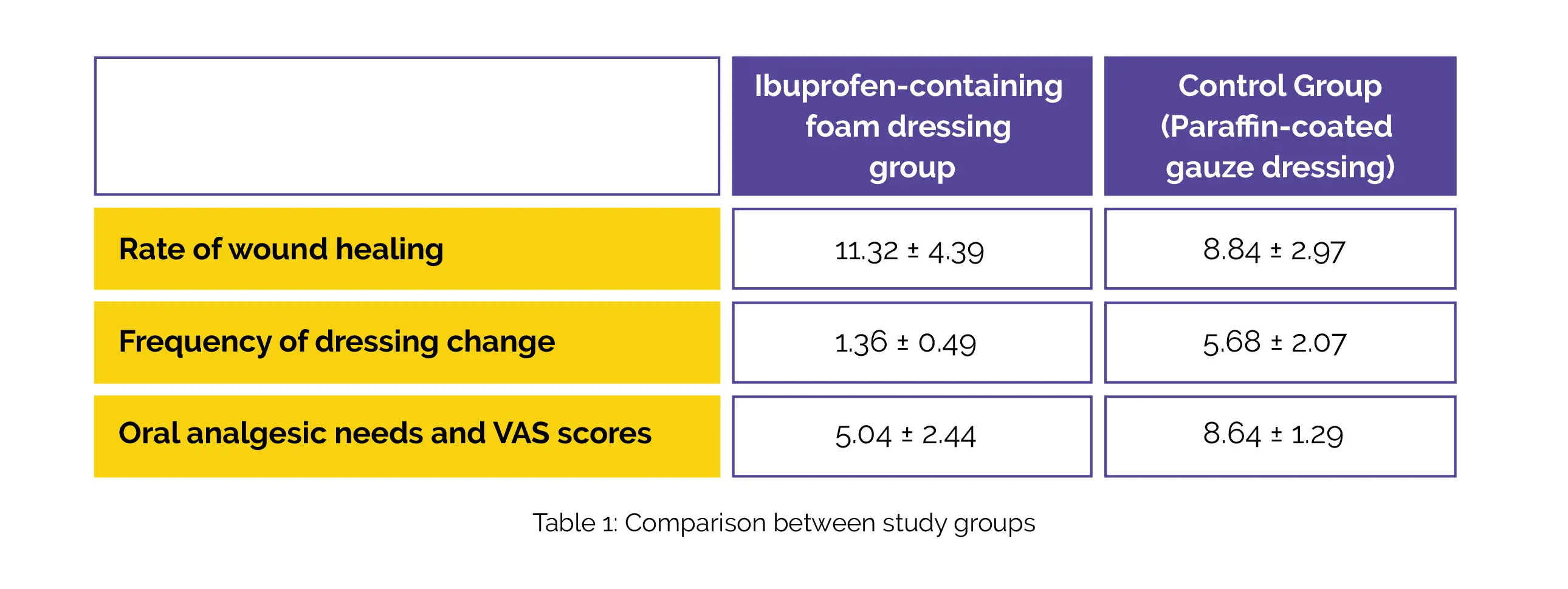 Compared to the control group, Ibuprofen-containing foam dressing group exhibited a significantly increased rate of wound healing, decreased frequency of dressing change, and lower oral analgesic needs and VAS scores, as shown in Table 1: