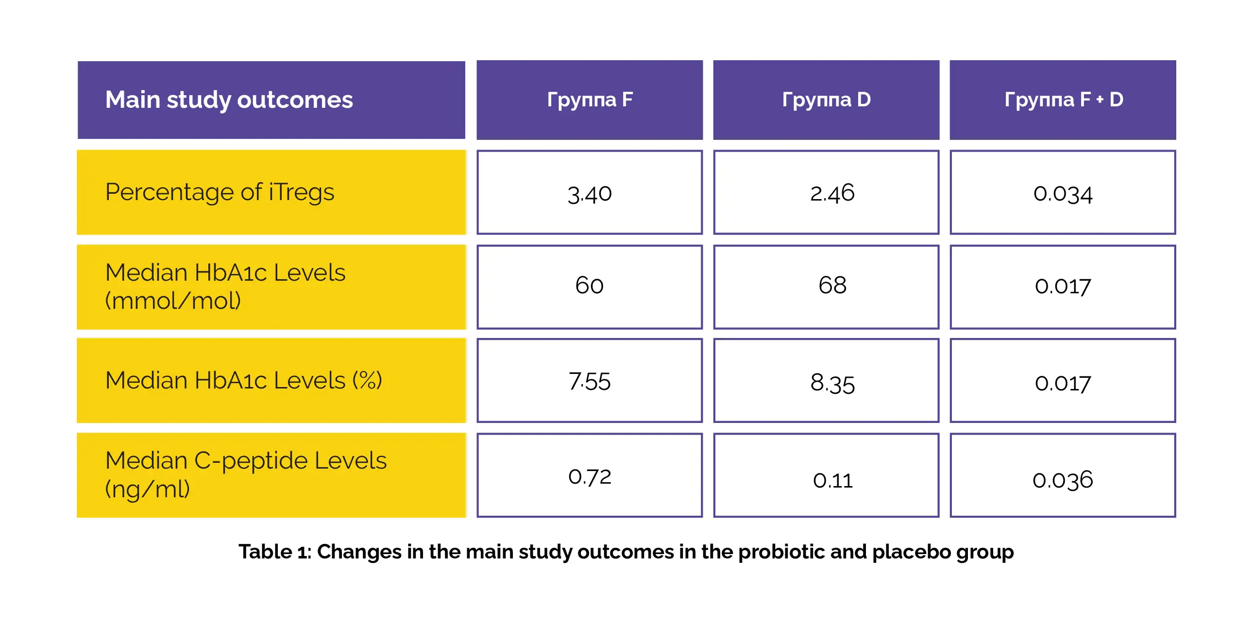 Twenty-three and 27 children in the placebo group and probiotic group accomplished the study, respectively. Compared to the placebo group, the percentage of iTregs increased considerably in the prebiotic group. The levels of HbA1c significantly lessened in the placebo group than in the probiotic group. The probiotics group had significantly elevated median C-peptide levels, detailed in Table 1: