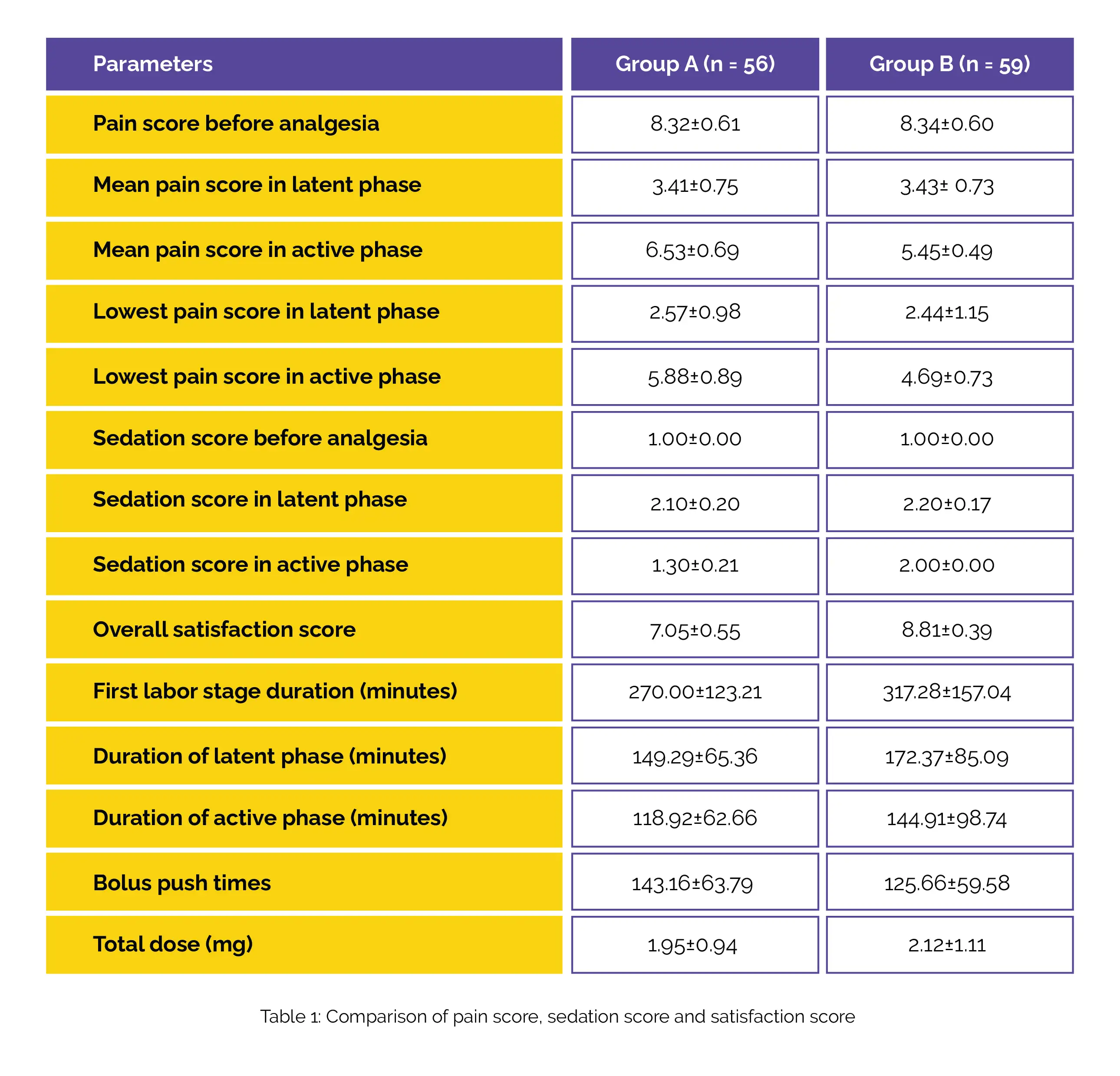 However, during the active phase of labor, Group B showcased remarkably reduced mean NRS pain scores, achieving the lowest pain score in comparison to Group A. Additionally, Group B displayed elevated scores for overall sedation and satisfaction in contrast to Group A. No noteworthy distinction was observed between the two groups in terms of the duration of the initial labor stage, the quantity of boluses administered, and the overall consumption of Remifentanil (Table 1).