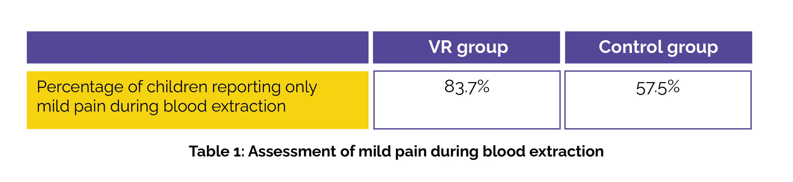 In conclusion, the use of VR during venepuncture demonstrated a tangible reduction in the pain experienced by children, along with heightened satisfaction levels among their families. This innovative application of VR technology presents a valuable avenue for boosting the overall experience of pediatric blood draws, showcasing the potential for broader integration into healthcare practices. These findings contribute to the growing body of evidence supporting the positive impact of VR in pediatric medical interventions.