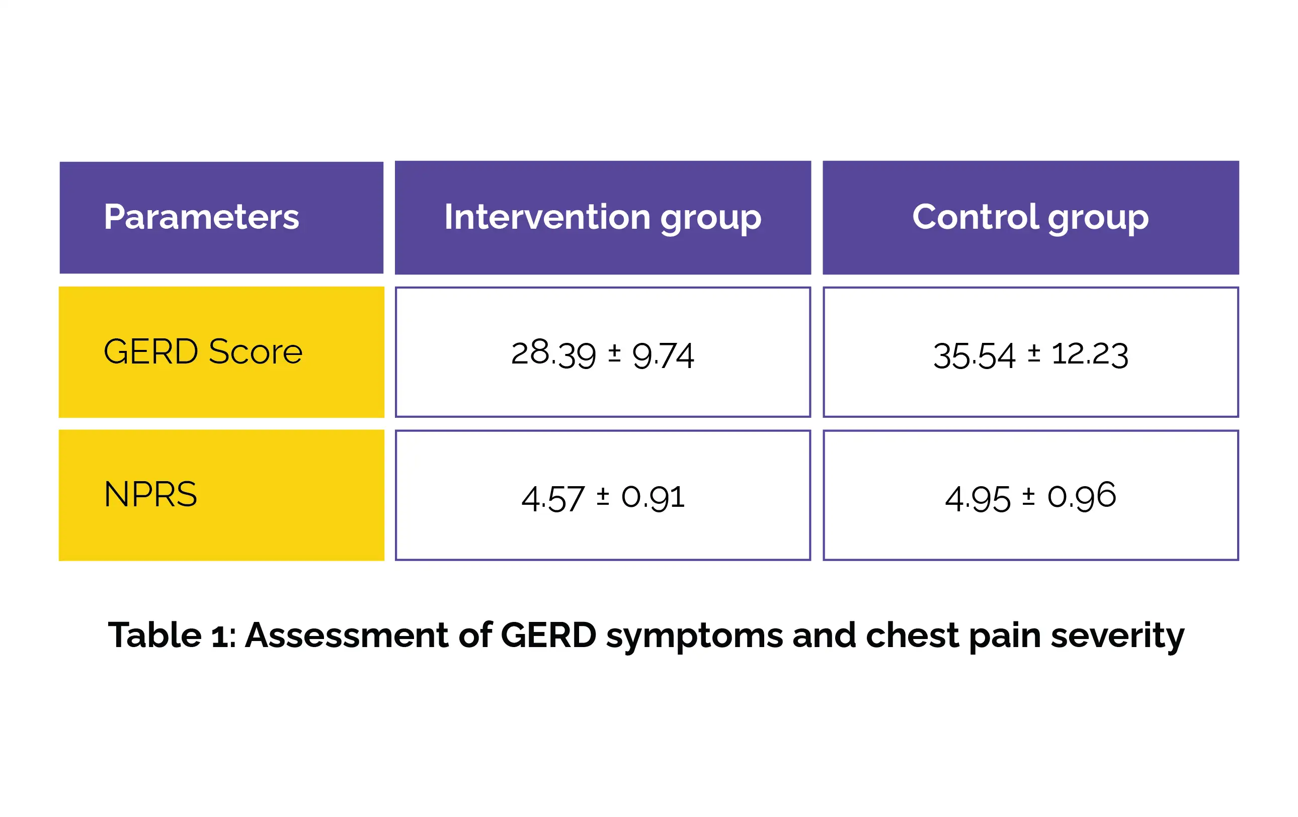 Endpoints like numerical pain rating scale (NPRS), beck depression inventory (BDI), hamilton depression rating scale (HDRS), and GERD questionnaire score were recorded at baseline and after 4 weeks. Baseline characteristics showed no difference between groups (p > 0.05). After 4 weeks, both groups improved significantly in depression, GERD symptoms, and pain (p < 0.001). However, the intervention group achieved better symptom control, especially for GERD severity and chest pain (Table 1).