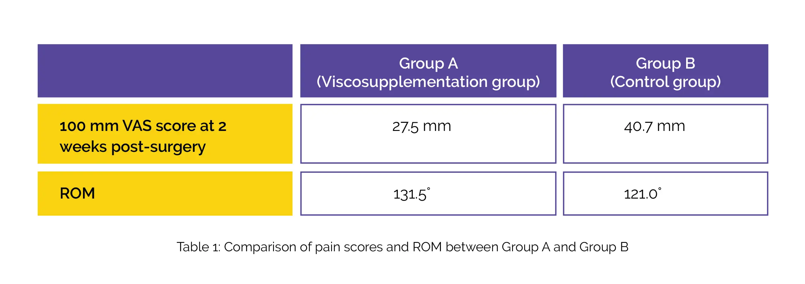 At two weeks post-surgery, the viscosupplementation group exhibited a considerably reduced 100 mm VAS score for pain and substantially higher ROM when compared to the control group, as shown in Table 1: