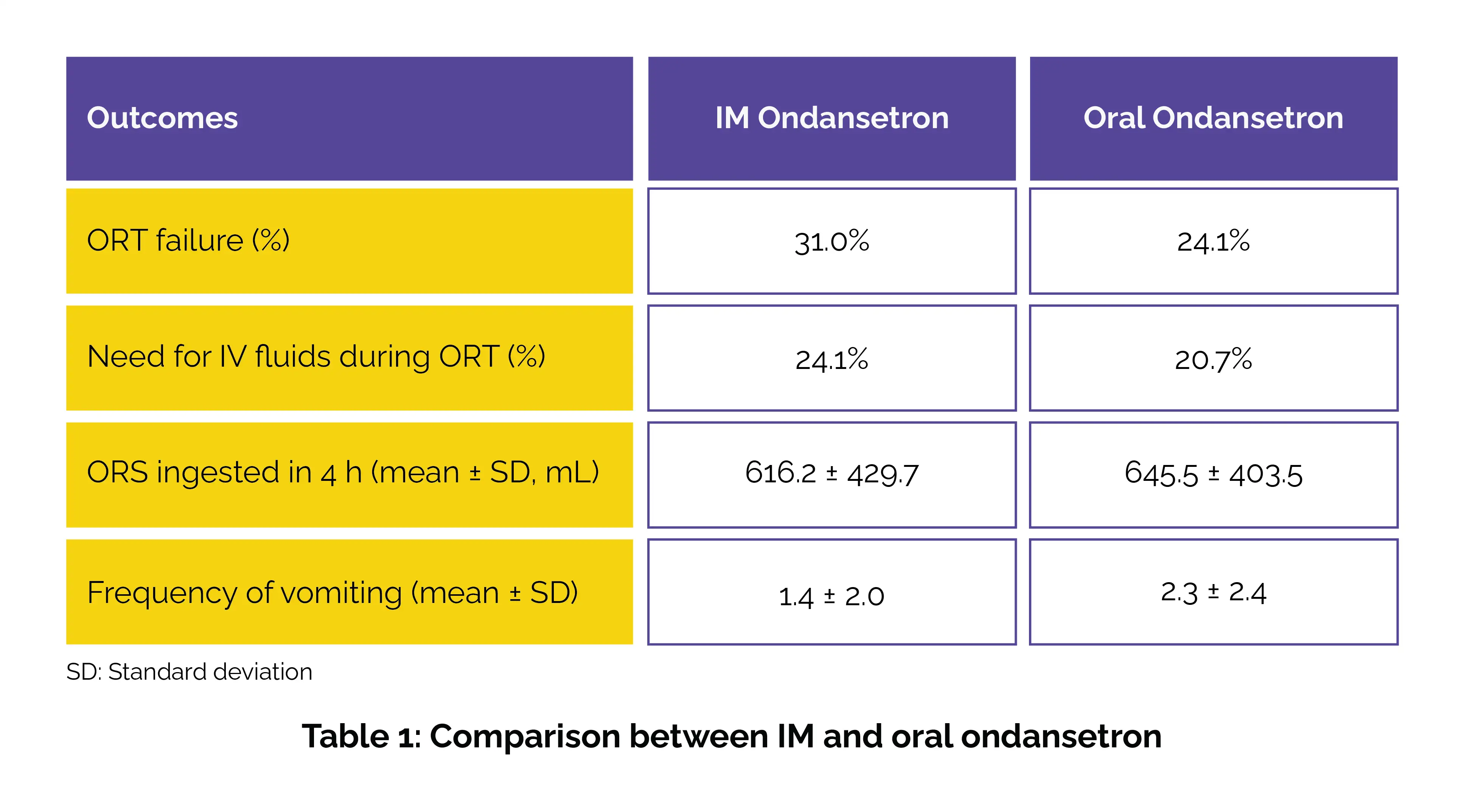 Of these, 58 children (29 per group) completed follow-up and were analyzed for all outcomes. The primary outcome—failure of ORT, defined as persistence of dehydration after 4 hours of ORT or the requirement for intravenous fluids, illustrated no statistically significant difference between the two routes (relative risk 1.3). Similarly, there were no vital differences in the need for IV fluids during ORT, the mean volume of oral rehydration salt (ORS) solution consumed after 4 hours, or the average frequency of vomiting episodes (Table 1).