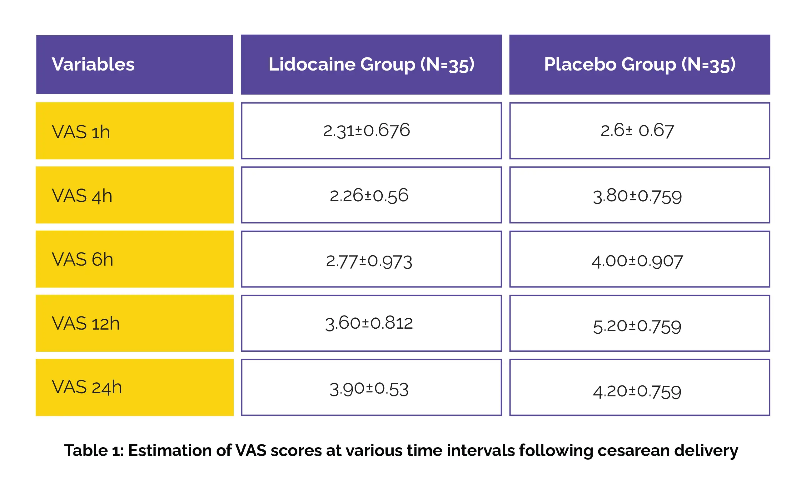 Secondary outcomes examined included the timing of mobilization and breastfeeding initiation, potential medication side effects, the duration of hospital stay, and the level of patient satisfaction concerning pain management. Key findings of the study included a remarkable reduction in VAS scores at 4, 6, and 12 hours post-cesarean section among the Lidocaine group compared to the Placebo group, as illustrated in Table 1: