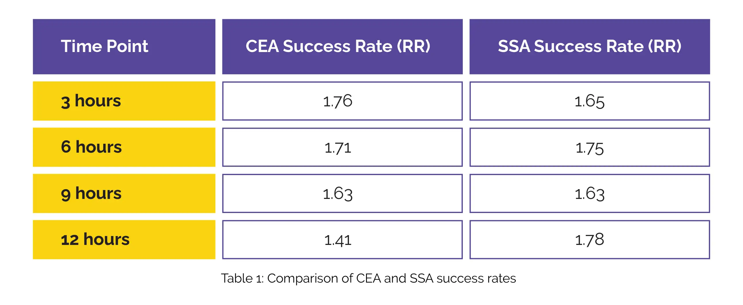 The pooled results demonstrated a statistically significant increase in the success rate of Clinician Erythema Assessment (CEA) (3 hours: ratio rate [RR] = 1.76, 6 hours: RR = 1.71, 9 hours: RR = 1.63, 12 hours: RR = 1.41) and Subject Self-Assessment (SSA) for rosacea facial redness  (3 hours: RR = 1.65, 6 hours: RR = 1.75, 9 hours: RR = 1.63, 12 hours: RR = 1.78) after administering Oxymetazoline compared to the vehicle (Table 1).