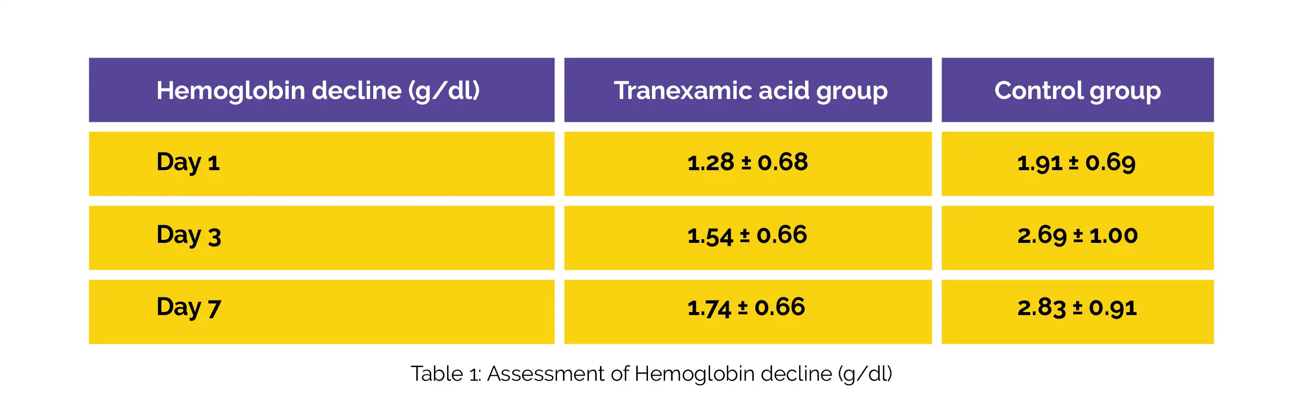 The disparity between preoperative and postoperative hemoglobin levels at days 1, 3, and 7 were used to determine the hemoglobin decline. The subjects in the Tranexamic acid group experienced substantially less perioperative total blood loss (543 ± 219 ml vs. 880 ± 268 ml). The hemoglobin decline was markedly less in the Tranexamic acid group than in the control group on postoperative days 1, 3, and 7, as shown in Table 1: