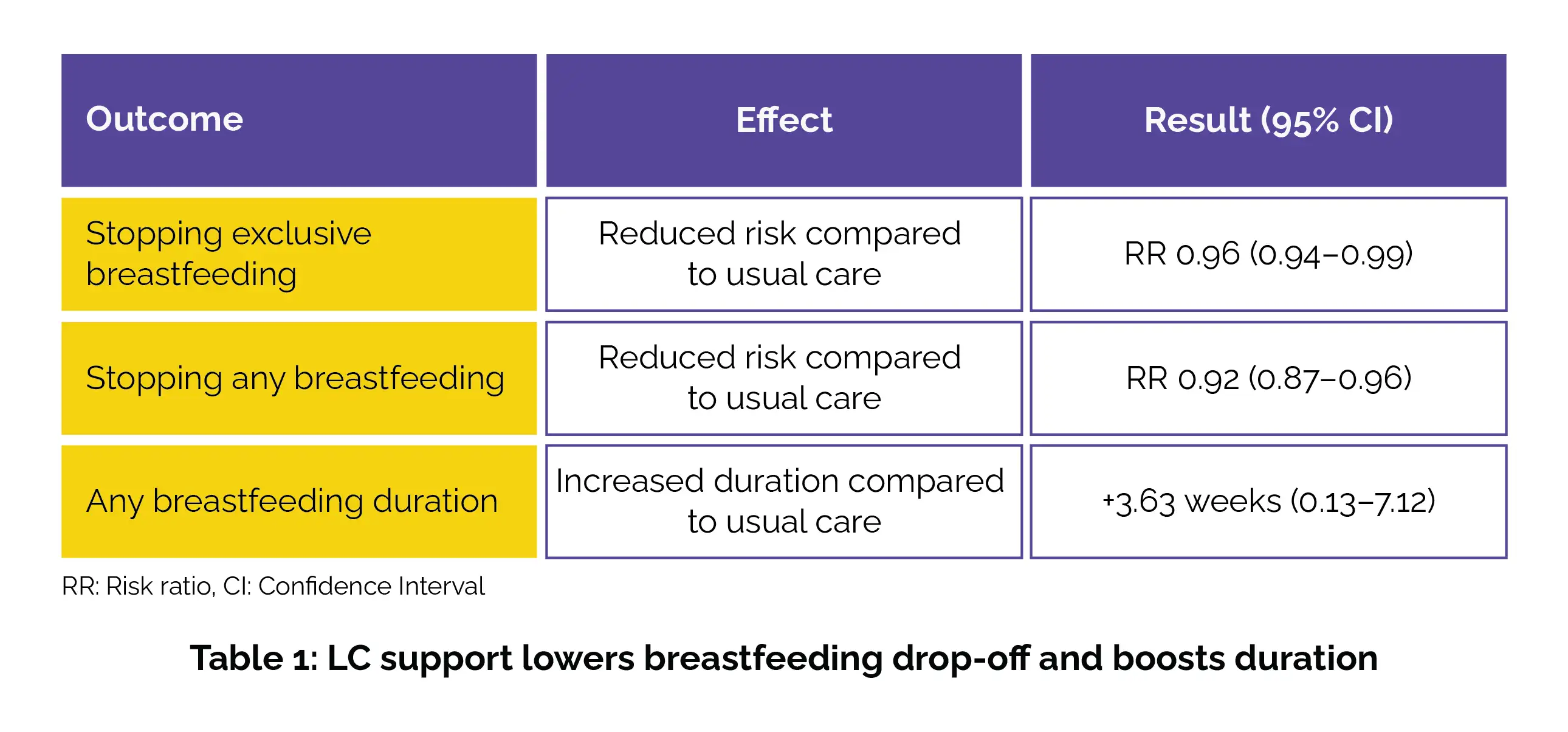 Compared to standard care, mothers who received support from trained LCs were significantly more likely to continue exclusive breastfeeding and any breastfeeding for longer periods. Specifically, the interventions reduced the risk of stopping exclusive breastfeeding by 4% and stopping any breastfeeding by 8%. On average, breastfeeding lasted nearly four weeks longer with LC support. (Table 1)